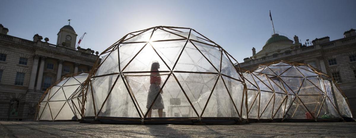 Los sin techo en doble riesgo. Por último, quiero hacer una reflexión a los que después de los sanitarios y todos aquellos que atienden nuestras necesidades de alimentos y medicamentos están más expuestos. Los sin techo, a ellos eso de aburrirse en casa les debe parecer un lujo. La imagen de inspiración es de una instalación que fue itinerante Pollution Pods, del artista Michael Pinsky; si no me equivoco están habilitando un albergue en Ifema para ellos en Madrid, pero quizás algún tipo de solución (aunque no sería necesario que fuera toda transparente como en la instalación) les ayudaría a preservar mejores condiciones de asilamiento. Alguno de ellos habla de que no puede separarse de sus animales y que en el albergue no tendrían cabida.