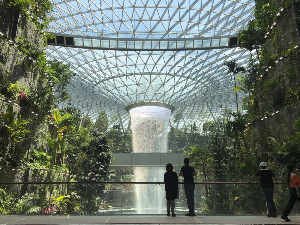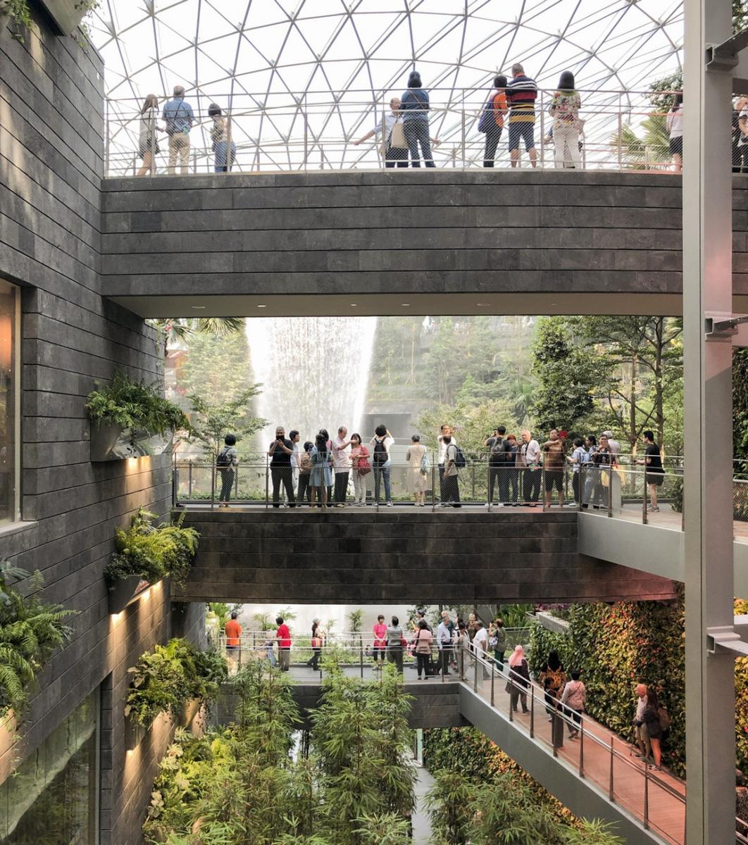 El equipo de arquitectos y paisajista pudieron probar las doscientas especies de plantas que habitan en las terrazas ajardinadas, en el Canopy park en la quinta planta con actividades y en el Forest Valley en la planta baja. La distribución en terrazas permite “perder de vista” a las personas y conectar visualmente con el exterior gracias a la fachada de cristal. Esta desaparece durante la noche y permite que se pueda contemplar la “Ciudad Verde”, como se refieren a Singapur, dentro del aeropuerto. Buscan entretener a los pasajeros, como con el espectáculo de luz de la cascada y enseñar su país aunque sea de manera metafórica a través de los jardines.