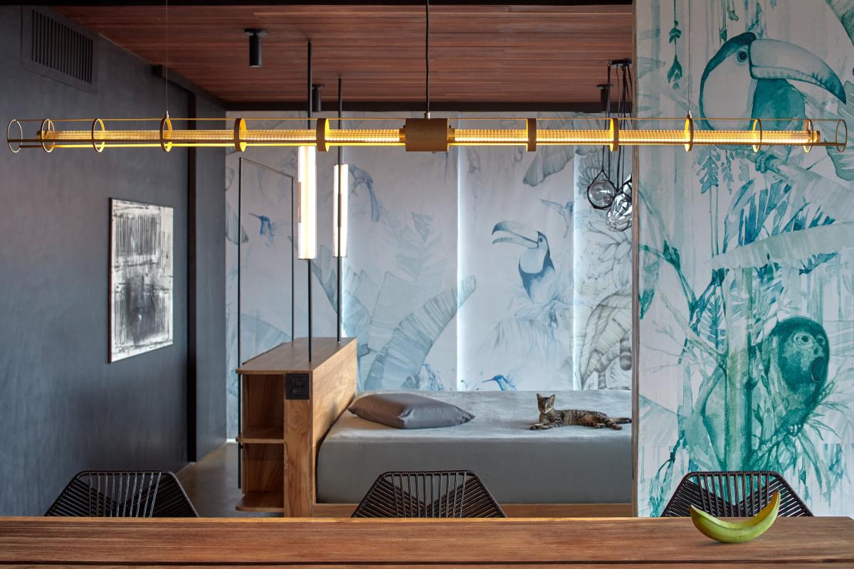 El acabado en el interior de los baños, cocinas y dormitorio de la Art Villa contrasta con el del material dejado sin pulir, casi podríamos calificarlo de áspero. Apuestan por un estilo brutalista con concesiones en los espacios más íntimos, como paños de pared pintados con acuarelas que muestran animales tropicales, mobiliario que pone el acento de color, baldosas hidráulicas de Nicaragua y un pequeño estanque circular en la entrada, con una iluminación que pone el contrapunto contemporáneo. Parece que encuentran la fórmula de hacer desaparecer un elefante ante de nuestros ojos.