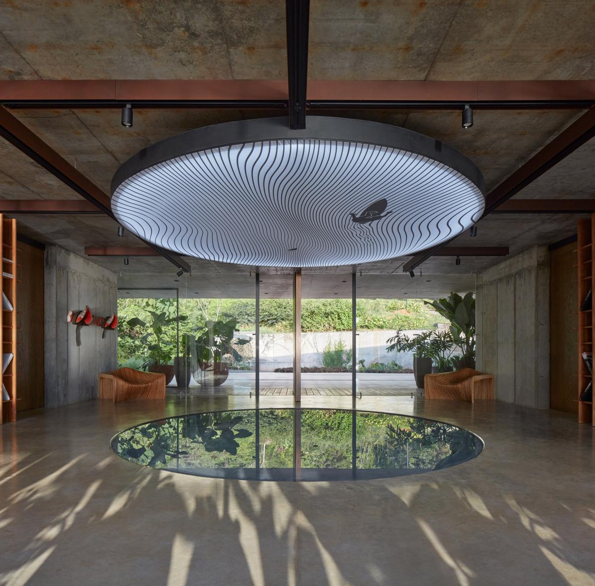 Me parece muy interesante como hacen desaparecer una estructura compuesta por dos grandes bloques de cemento, casi como si los hubieran dejado sin acabar, sin pulir; algo que podríamos calificar como megalítica, según sea la visual. De esta estructura de doble altura emerge una piscina perpendicular, que parece desafiar las leyes de la gravedad.