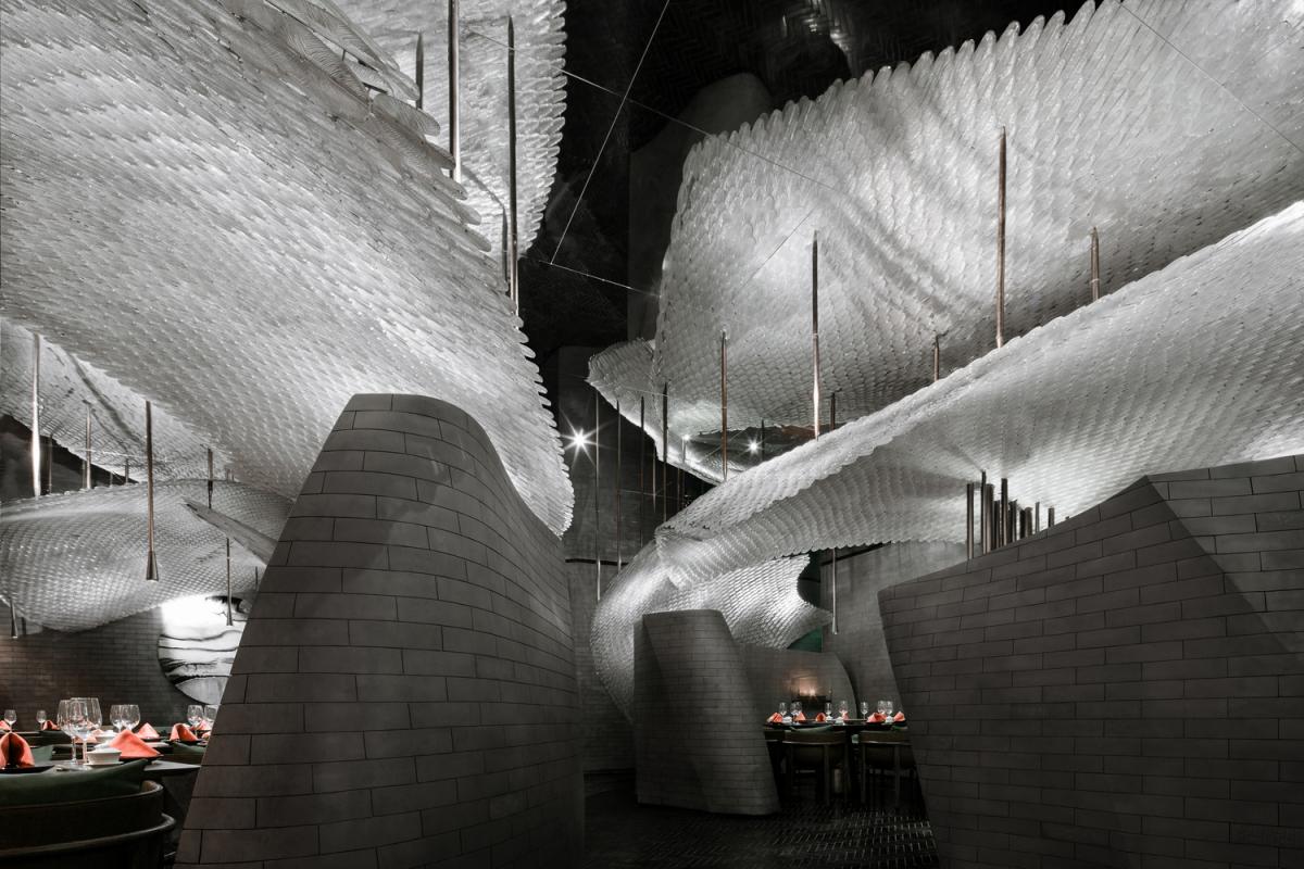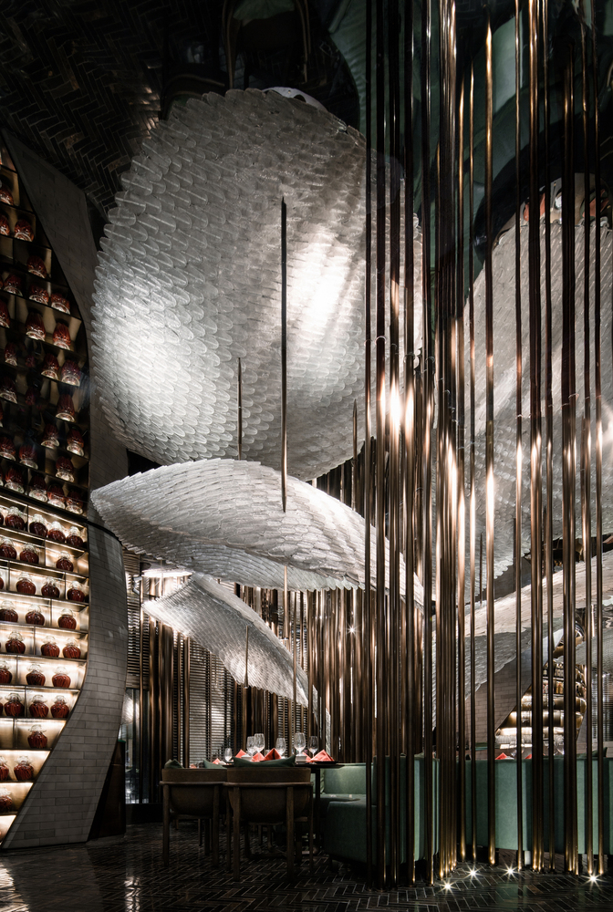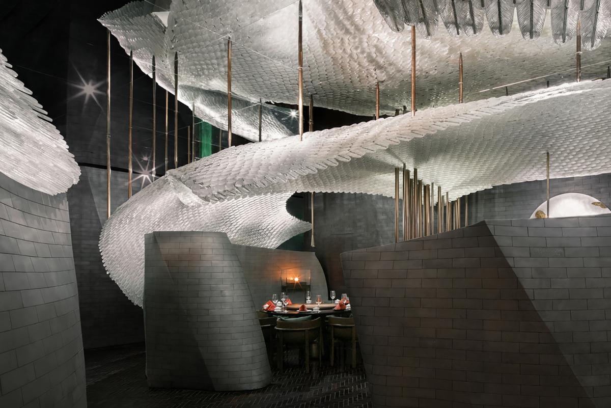 Los límites del local se desdibujan al jugar con los reflejos, el techo parece más alto ya que los clientes pueden llegar a acariciar las alas de grulla que acotan los diferentes espacios. Esta ave representa la nobleza, el honor y también la suerte y el éxito en la tradición china. 400.00 plumas traslucidas que dibujan una marea, un segundo techo para este restaurante, pero más que eso un concepto: explicar las tradiciones a partir del uso de materiales y técnicas novedosas.