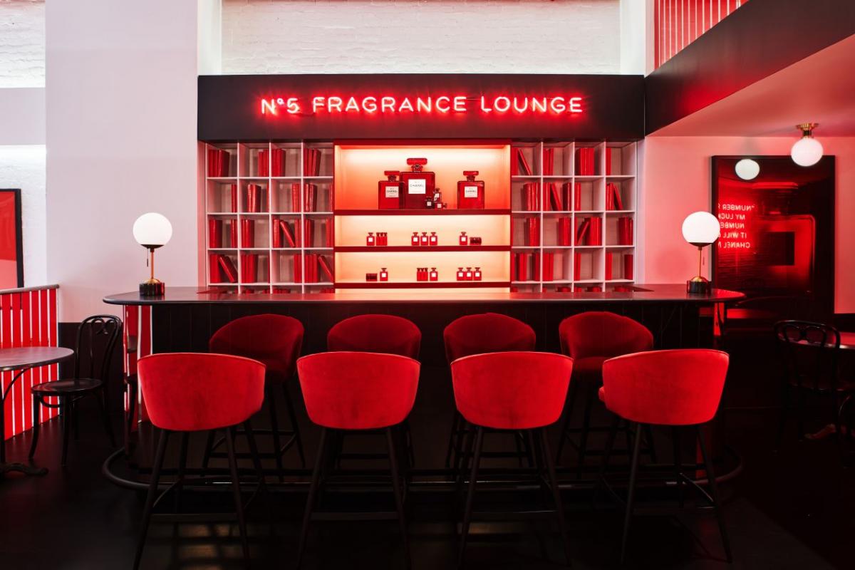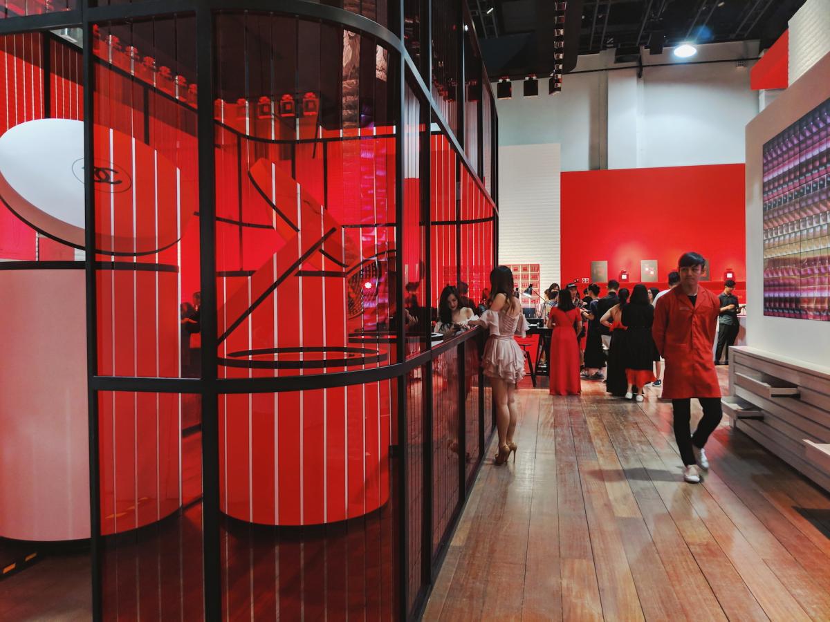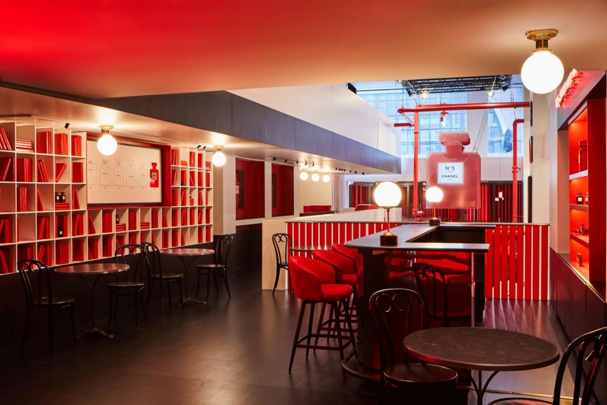 Chanel testea en Le Rouge, su pop-up en Nueva York y Singapour, ambientes que transitan entre un salón de París y polveras y botes de su perfume más icónico sacados de escala; como elemento común y central su color emblema, el rojo.