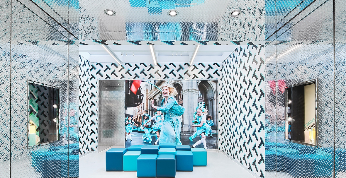 Tiffany encargó la tienda de Covent Garden como una apuesta por la innovación y la personalización en contrapunto al imaginario asociado a la quinta avenida. Sin renunciar a su azul, que como en Chanel es parte de su imagen de marca, pero aplicando una trama a los interiores; configurada sólo con su inicial “T”, o con los hastags animándonos a expresarnos tal cual somos. Un lugar más relajado en el que los clientes pueden sacar la nueva fragancia de una máquina de vending tuneada con sus colores.
