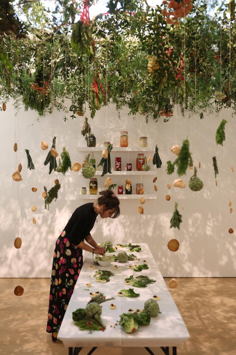 Finalmente realizó una instalación en la que todos los sentidos estaban en activo. Un bosque imaginario comestible, colgado del techo y sobre las mesas una composición de malas hierbas y sabrosas flores, que se pueden encontrar en los alrededores de Londres. Sabores ocultos de la ciudad.