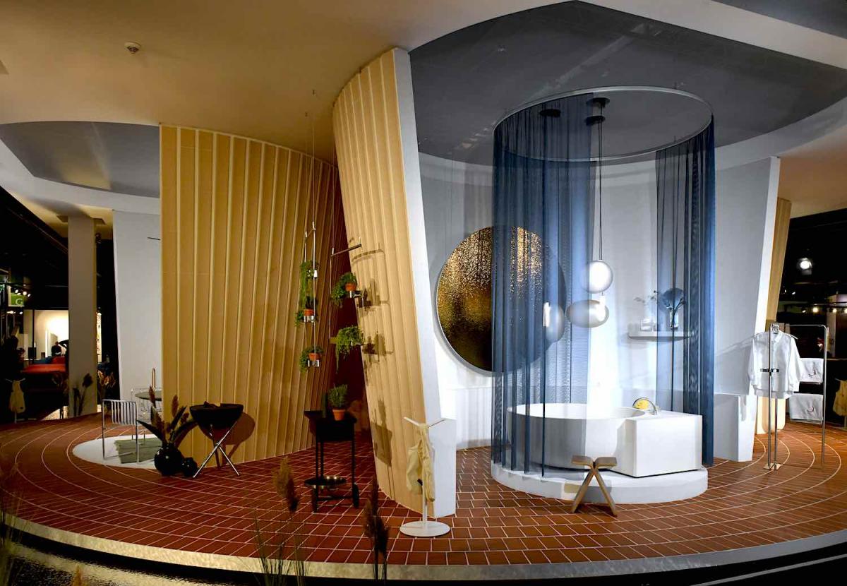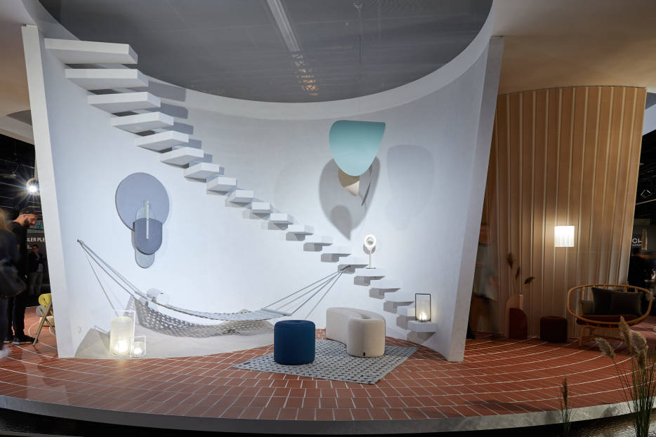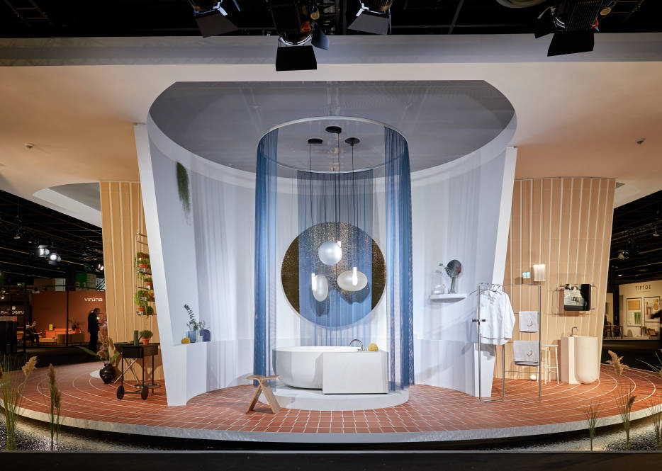 Luz, agua y formas curvas son los tres elementos base con los que Mut Design recrea el concepto de vivir en el mediterráneo en la Feria de Colonia. Una sensación de hogar que bebe del exterior, poniendo de manifiesto un tema cultural: vivir más al aire libre que en el interior; una idea ligada a la tradición cultural con raíces en el pasado árabe, los patios romanos centro de la casa.