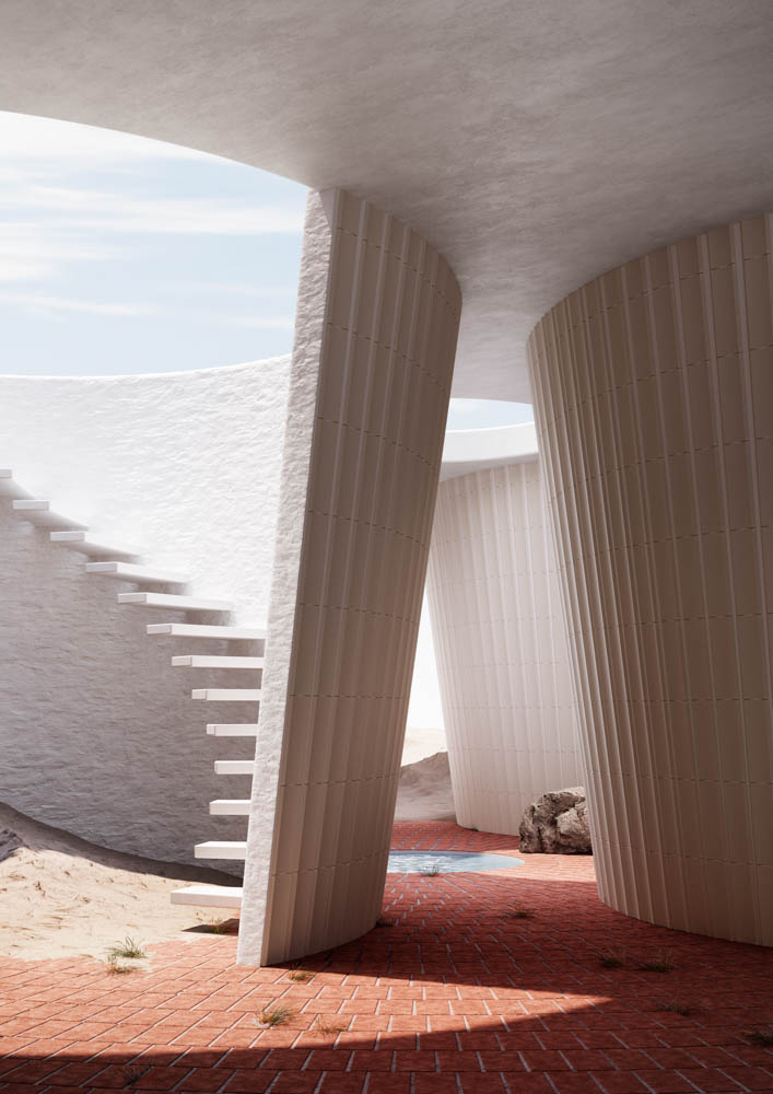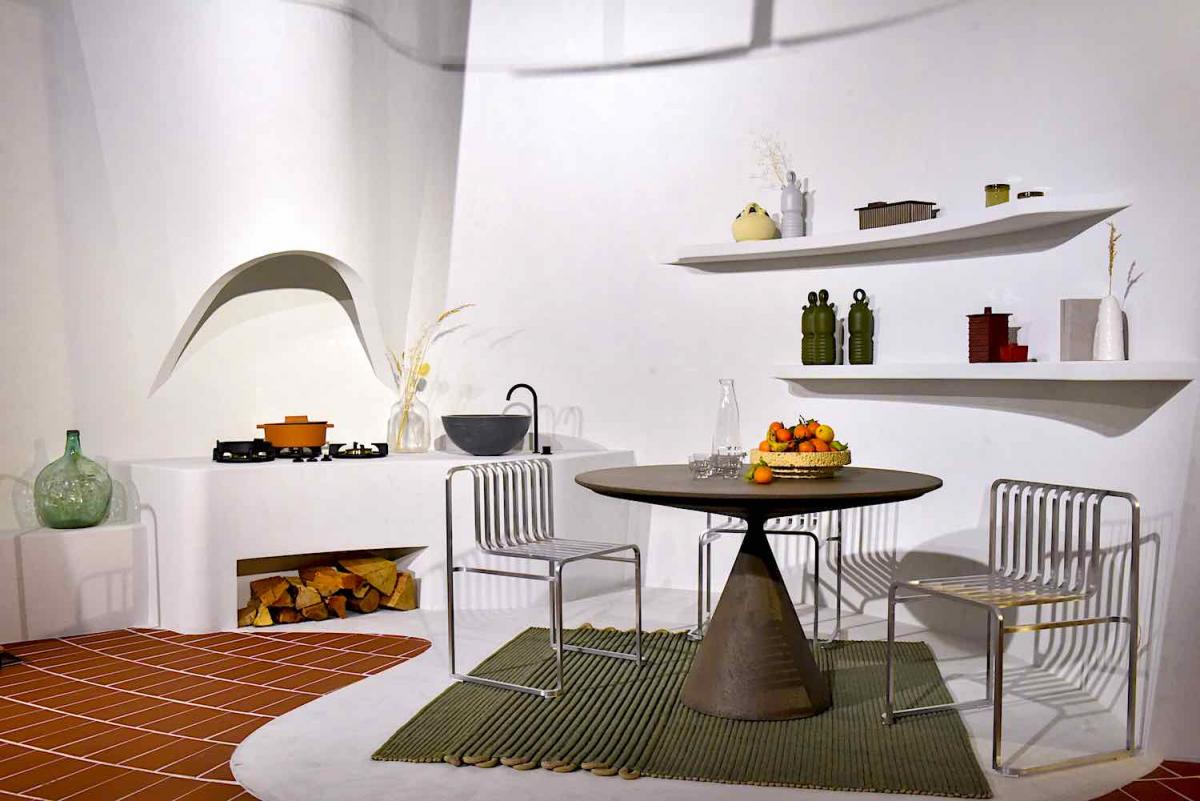 Generan cuatro cuevas abiertas, conos trucados invertidos para mostrar espacios domésticos poblados de objetos que nos traen al imaginario escenas de comidas al aire libre, en comunión con la naturaleza. El suelo en terracota contrasta con el blanco de las paredes que explica la tradición de encalar las casas para así conseguir dejar el calor fuera.