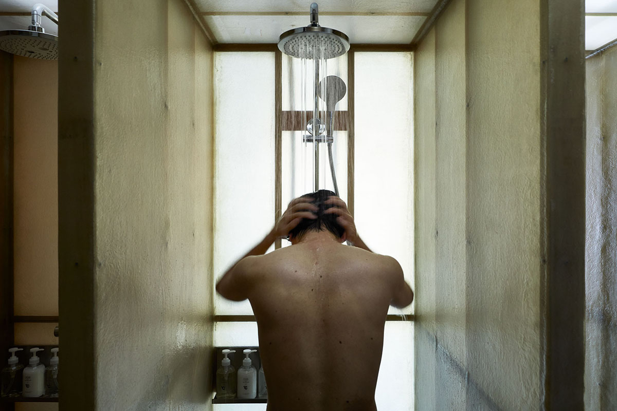 Se combinó la zona más íntima con un punto retro, las capsulas, con espacios más minimalistas modernos dónde ofrecer una sauna al más puro estilo finlandés y en lugar de baños fríos se utilizó duchas con tecnología que simulan la misma sensación. Máximas prestaciones térmicas con un uso eficiente del espacio. El área de las duchas está acabado con una combinación de fibra de vidrio, que al permitir el paso de la luz, deja ver la estructura, con marcos de madera, pero tan solo intuir la sombra del que se esta duchando y ser resistente al agua y a la humedad.
