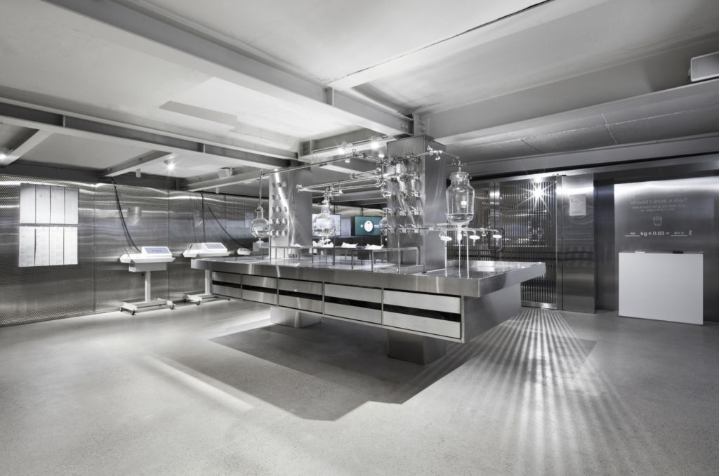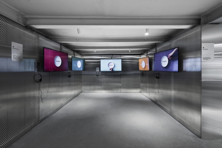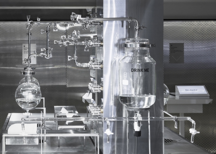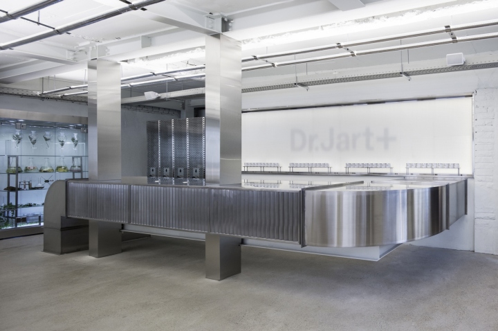 El acento está puesto sobre la practicidad, dando un nuevo enfoque a lo que sería previsible en una firma de cosmética. Los tres elementos aire, agua y luz en su estado más puro, reforzando la idea de ofrecer un espacio libre de impurezas. En la entrada instalan una cabina que limpia al visitante, en el interior el aire está filtrado. A continuación un bar de agua, en el que saborearla purificada; porque nuestro cuerpo está compuesto en su mayoría por este elemento. La luz casi de laboratorio, sinuosa, un elemento continuo más. Los elementos de branding presentes principalmente en las planchas perforadas y en monitores, pero por el resto un ambiente bastante limpio.