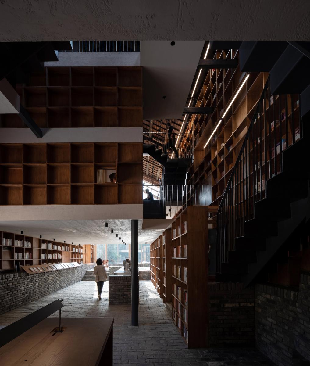 Esa nueva apertura llena de luz el espacio interior sin divisiones y crea una zona comunitaria a la que pueden acceder los huéspedes que se alojan en este hotel capsula. El nuevo espacio alberga una impresionante biblioteca, con una altura total de 7,2 m y cuyas paredes están recubiertas por estanterías de bambú de suelo a techo. Un paraíso para los amantes de los libros impresos en papel. Un refugio, un retiro en nuestra era digital. Esa nueva apertura llena de luz el espacio de altura libre sin divisiones, excepto por las plataformas distribuidas estratégicamente para poder asomarse.