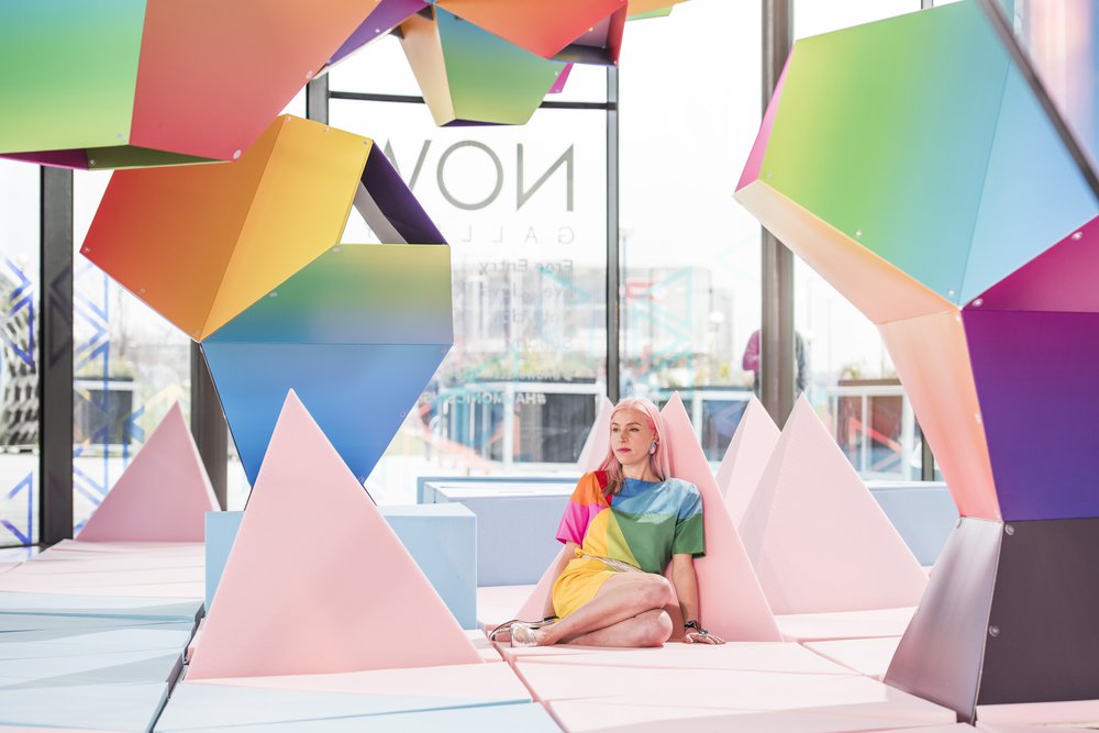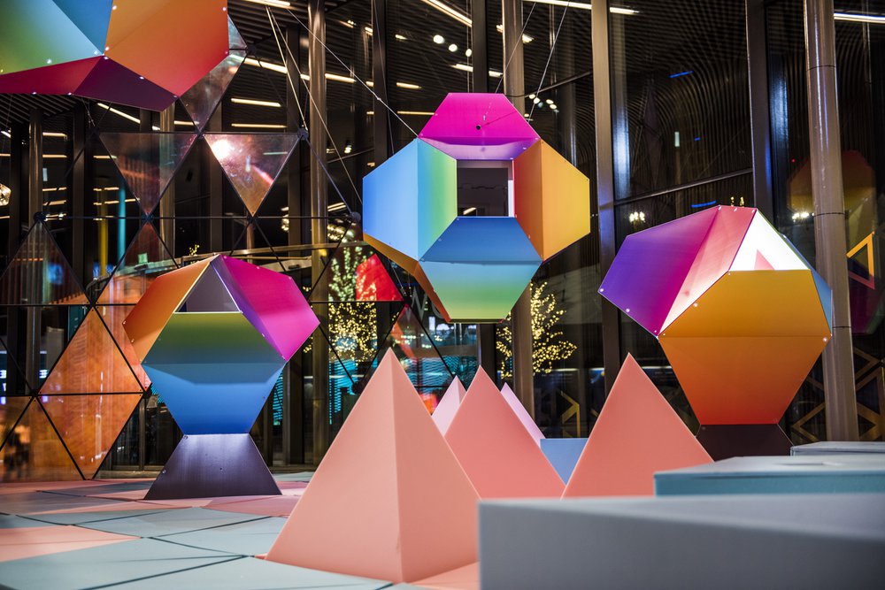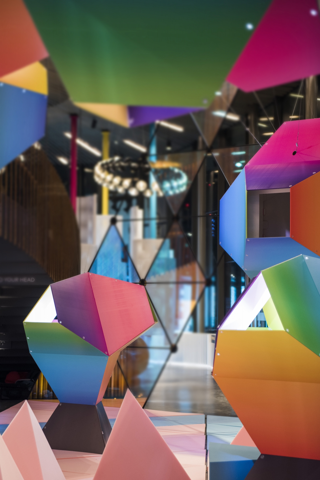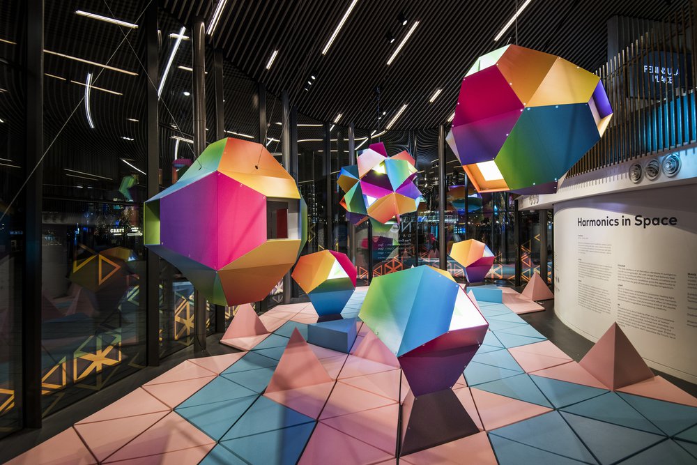 ¿Pueden los colores vibrantes, como los de la exposición Harmonics in Space, ayudarnos a entrar en un estado mental zen? La respuesta es sí. Generalmente asociamos al uso de colores poco saturados, incluso lo acotamos a diferentes tonalidades de blanco; el amplio espectro de colores de la instalación, la vibración de cada uno de ellos, carga nuestro nivel energético; se trataría de aplicar la cromoterapia al espacio físico, con el objetivo de aumentar nuestro bienestar.
