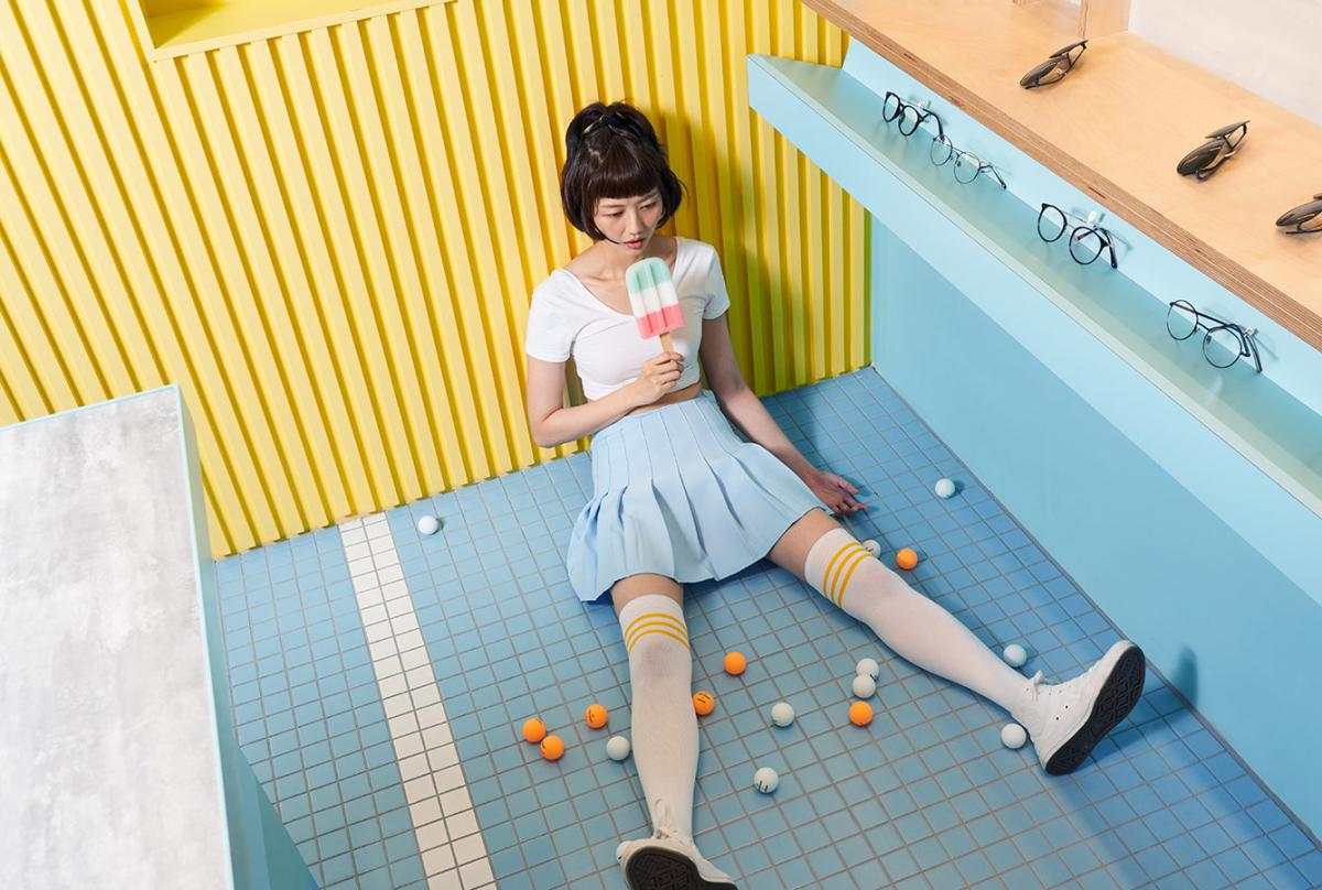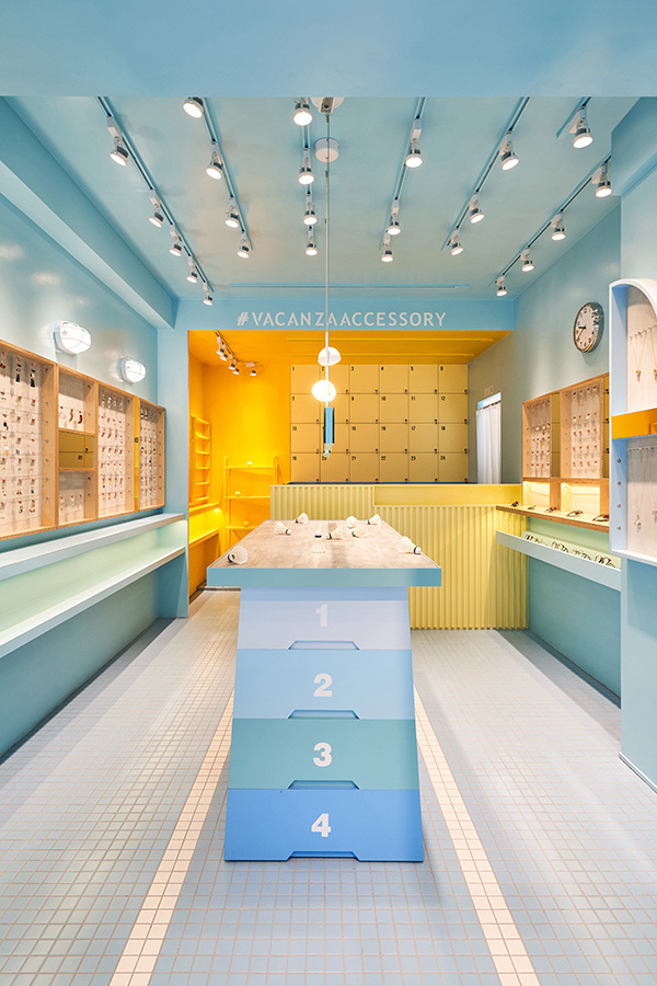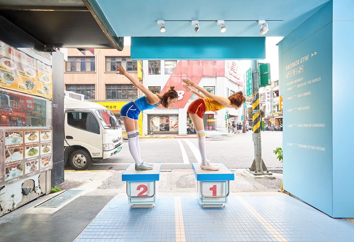 Vacanza accesories consigue destacar en Taipei con un interior que invade la calzada, un pavimento continuo que la coloniza haciendo que la calle se convierta también en parte de la tienda. Llama la atención del transeúnte incluso si van andando despistado sin levantar los ojos del móvil. Así el escaparate se traslada casi a la calle. Tratan de recrear el ambiente de un gimnasio, incluso instalando un par de podios en es zona de transición en la entrada.
