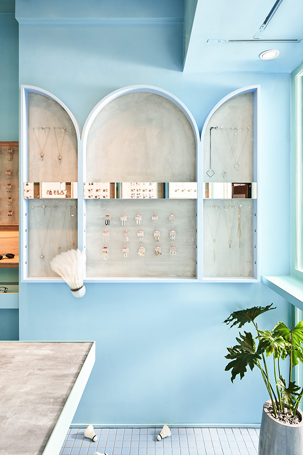También con el mobiliario inspirado en la práctica de deportes en el interior que incluye unos lockers y expositores que trabajan con diferentes texturas, acabados, generando un ambiente complejo rico en texturas pero ordenado. De esta manera aprovechan la distribución estrecha de esta planta generando un ambiente en el que el producto queda expuesto en secciones a la altura de los ojos y estas invitan a recorrer toda la tienda.