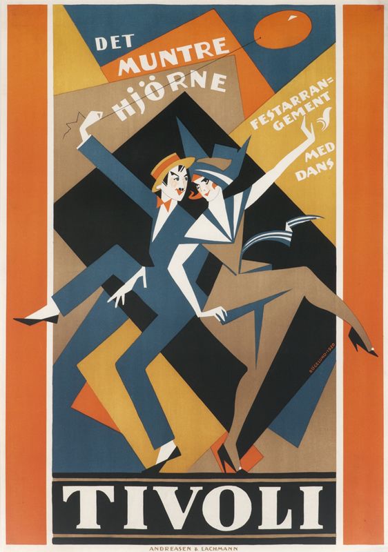 Tivoli. Termino esta pequeña selección con este cartel del danés Thor Bogelund. De alguna forma el cartel resume como vemos “aquello locos años 20”. Una sociedad que salía del horror de la primera guerra mundial y quería vivir el momento con la máxima intensidad con el temor que de volviera la guerra, como así fue. Estos personajes frívolos y díscolos nos siguen pareciendo modernos hoy, sobre todo las mujeres activas que no se quedan en casa y bailan foxtrot y charlestón, las flappers. Y, por supuesto, una gráfica acorde con ese espíritu hedonista y festivo.