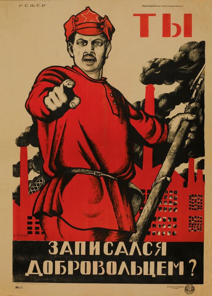 ¿Eres voluntario para el ejercito rojo? Dmitrii Moor hace en 1921, esta versión soviética del conocido cartel para enrolarse al ejército americano de James Montgomery Flagg de 1917. La tradición de esta imagen en la propaganda de bélica llega hasta casi nuestros días, donde esa imagen de una mirada fija y un dedo acusador quiere interpelar al observador. D.Moor era el nombre profesional de Dmitry Stakhievich Orlov, un artista ruso conocido por sus carteles de propaganda. El seudónimo "Moor" fue tomado del nombre de los protagonistas de la obra de Friedrich Schiller “Los ladrones”.