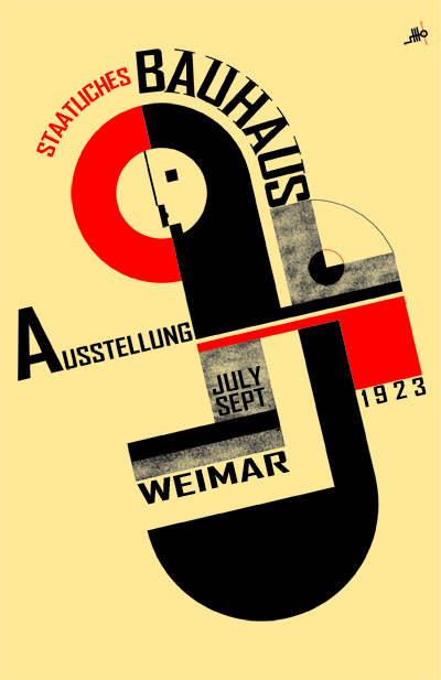 Bauhaus Exhibition in Weimar. Este fue el cartel que Joost Schmidt hizo para la exposición que pretendía mostrar al gobierno de Weimar lo que hacían en la escuela en 1923. El cartel se hizo muy conocido y la Haus am Horn (casa modelo) se convirtió en lugar de peregrinación para aquellos arquitectos y diseñadores que querían saber que estaba haciendo esa escuela de la que todo el mundo hablaba. No sirvió de mucho y el gobierno local, ya dominado por el nacionalsocialismo los expulsó. En Dessau la Bauhaus viviría una segunda etapa.