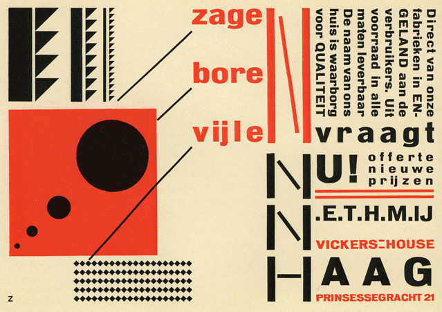 N.E.T.H.M.IJ. 1923. Cartel publicitario para la empresa de pavimentos Vickers House. Piet Zwart es uno de los diseñadores más interesantes de ese momento en Holanda. Difícilmente clasificable, aunque a menudo se lo enmarca en De Stijl, ejerció de diseñador industrial, interiorista y grafista. Realizo varios anuncios para este mismo cliente. "Zagen, boren, Vijlen" (sierras, taladros y archivos). Reunió letras, espacios en blanco, y los símbolos de las imprentas y jugó con ellos. En este juego de palabras una sola N sirve como la letra final de las tres primeras palabras. Sigue siendo rompedor y sugerente.