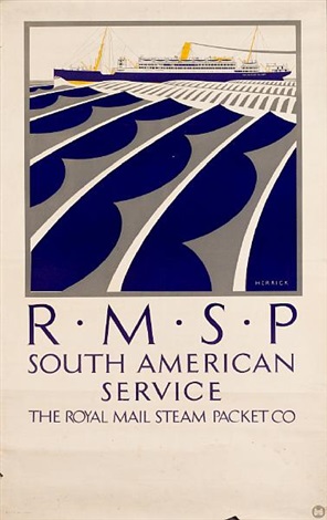RMSP South American Service. Este cartel de 1921 obra del grafista inglés Frederick Charles Herrick. Herrick fue un destacado artista gráfico después de la Primera Guerra Mundial, y se formó en la Leicester School of Art y en el Royal College of Art de Londres. Enseñó en Brighton durante muchas décadas. El cartel muestra el auge que tenían los viajes trasatlánticos con los conocidos paquebotes y el glamour de este tipo de transporte que se expandiría años más tarde en su interiorismo. Quizás el cartel más famoso de este tipo es que Cassandre haría para el buque Normandia en 1935. Pero en este que vemos cabe destacar el gran partido que extrae el diseñador de las tintas planas.