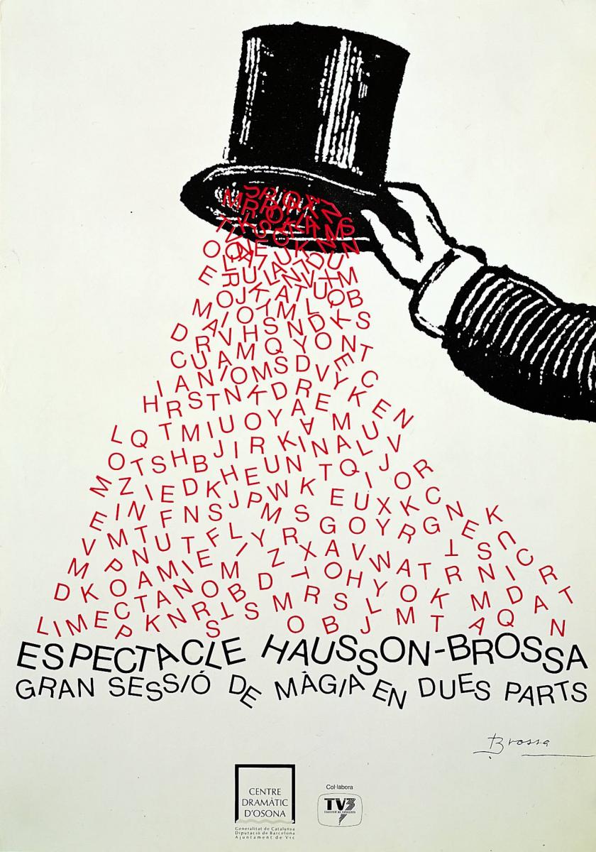 Pero hoy nos fijaremos en su trabajo como grafista. Dentro de su poesía visual hay mucho de grafica, de composición, de tipografía y de oficio. Su trabajo, no solo tiene una calidad indiscutible sino que influyo y mucho a varias generaciones de diseñadores gráficos. “Los carteles publicitarios sobre sus representaciones teatrales y exposiciones artísticas serán también obras de arte, poemas disfrazados que hacían de cartel” Decía el diseñador e historiador Enric Satué. El mismo siempre interpretó la creación de estas piezas como una prolongación de sus obras de poesía visual. "No me he considerado nunca un cartelista. A lo sumo, hago poemas que sirven de cartel". En consonancia con ello, los carteles de Joan Brossa se caracterizan por el equilibrio expresivo que obtienen la imagen y el texto. Otra de sus principales características es el uso de la tipografía como elemento visual, donde a través de sus formas, disposiciones, pesos, etc… la dotará con una alta carga conceptual, influenciada por vanguardias como el dadaísmo o el constructivismo.
