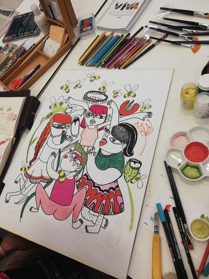 Este año, dentro de los actos que se celebran en Barcelona con motivo del 8 de marzo, han coordinado una Maratón de Ilustradoras Ecomefimistas en el espacio de Fabra Coats. Nueve ilustradoras referentes en la ciudad y habituales de Femiñetas, crearon en directo una obra relacionada con los ecofeminismos: Lola Vendetta, Zinteta, Rocío Quillahuaman, @pnitas, Bellina Ilustra, María Pichel, Catalina Parra, Daniela Efe y Carmela Caldart.