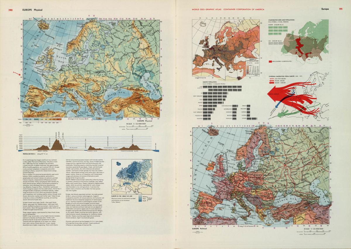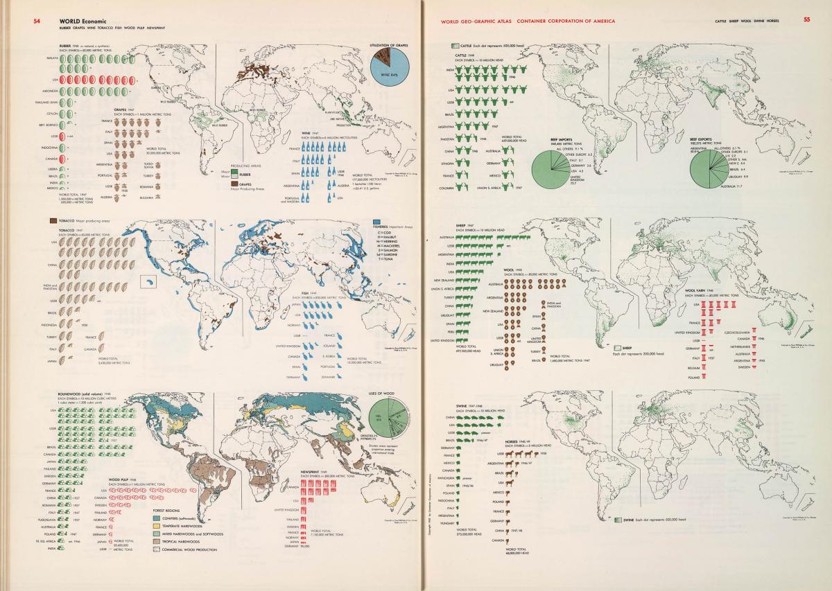 Personalmente, hay un trabajo de Bayer que me fascina. Se trata de un Atlas concebido como regalo de empresa de la CCA en 1953. En este Atlas Bayer aplicó las teorías comunicativas más novedosas, incluyendo la representación estadística usando Isotype creada por Otto Neurath y Gerd Arntz a principios del siglo XX y que son los precendentes de las actuales infografías. El atlas de Bayer combinaba la cartografía tradicional, con las ilustraciones, textos e informaciones estadísticas reflejadas de modo más abstracto. Hoy en día sigue siendo el referente absoluto en cuanto a comunicación visual en obras de este tipo.