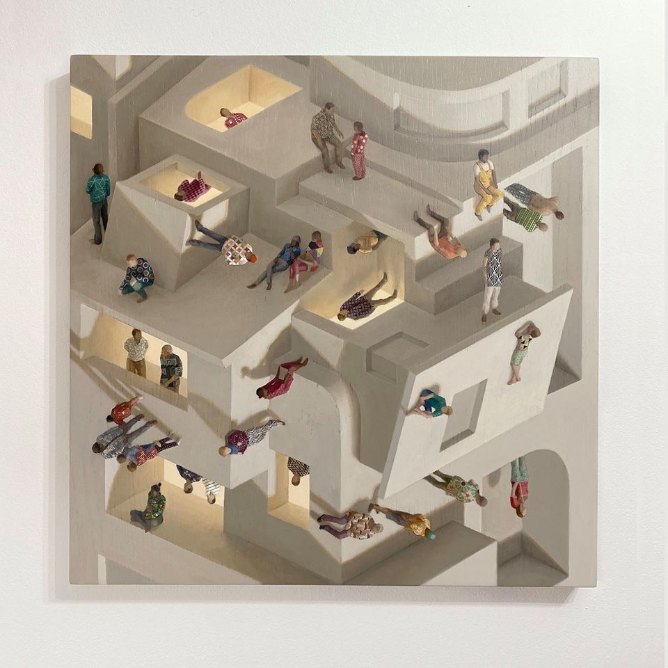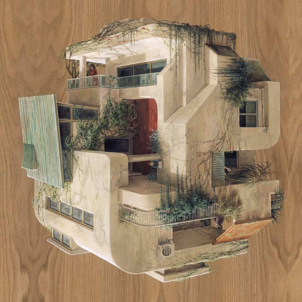 Cinta es artista visual, muralista, ilustradora, pintora de decorados de escenografía. Aprendió este último oficio con los míticos Castells i Planas. Y de allí saltó a hacer su obra personal, acostumbrada a pintar en grandes superficies no le ha sido difícil pasar de los telones de escenario a los murales. Su pintura muestra arquitecturas imposibles, casas poliédricas. Entre la casa de Mon Oncle de Jaques Tati y los dibujos de Escher. Sus personajes estan a menudo en reposo, entre la espera, la meditación y el letargo. Estos días está colgando casas donde nadie sale de ellas, también propone un juego de colgar una de sus multicasas preparada para que la pintemos. Sus cuadros siempre me hacen soñar y cuando la casa se me cae encima me pierdo en ellos. Son como una ventana a la evasión, me quedo embobado viendo los detalles, las perspectivas, las sombras, los personajes. Un trabajo espectacular sin ínfulas, hecho desde el oficio. Muy recomendable este artículo sobre ella.