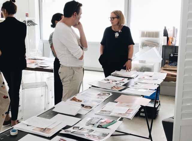 Reunión de trabajo en la agencia Nelly Rody donde se revisan distintos materiales (colores, materiales, repports de moda, datos de mercadotecnia (imagen www.nellyrodi.com)