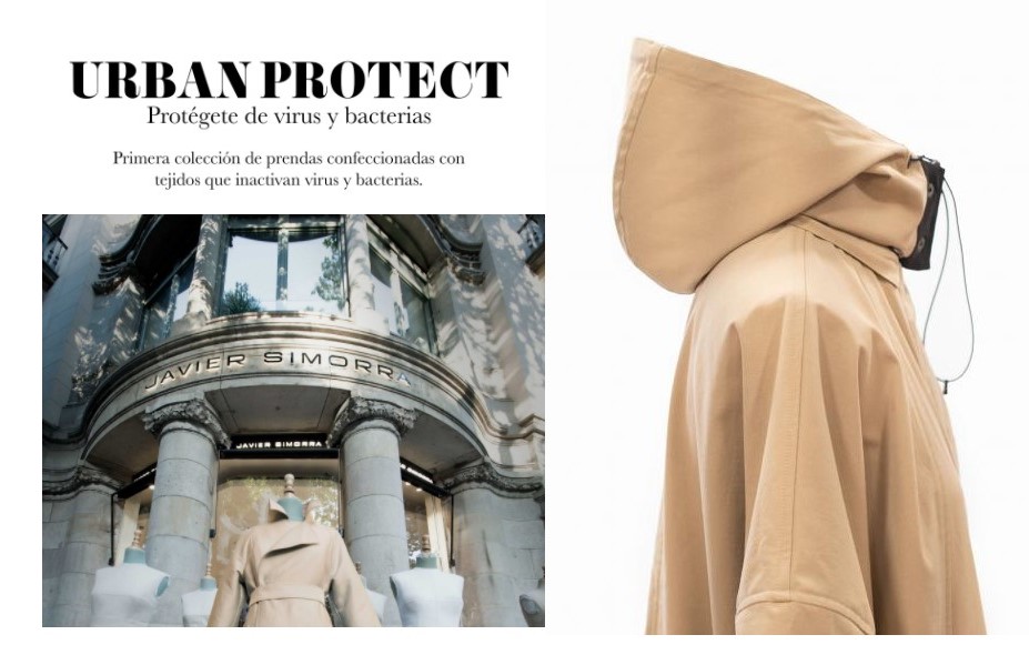 En un contexto de pandemia , encontramos empresas españolas de gran tradición como la catalana JAVIER SIMORRA, la cual acaba de presentar un proyecto muy innovador conocido como URBAN PROTECT, una colección de prendas urbanas tales como abrigos y trenchs, confeccionados con un material antibacteriano. Obviamente no es un tejido 100% libre de contagio, pero lo disminuye ostensiblemente, como dice su director general, Eduardo Dimas: "esto no es un escudo que evite que te contagies, es simplemente un elemento de protección más".