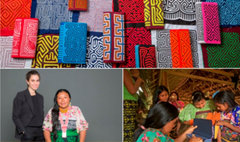 Imágenes de la marca Mola Sasa y de su fundadora, Yasmin sabet junto mujeres de la comunidad Kuna https://www.molasasa.com/