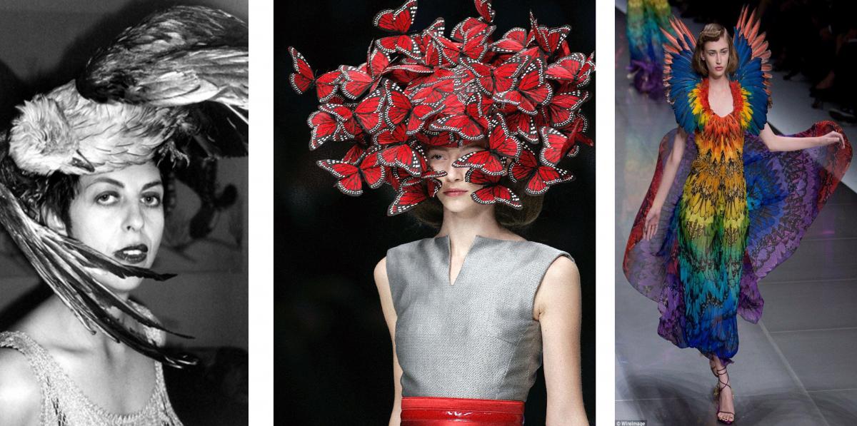 La editora de moda Isabella Blow e imágenes de su desfile homenaje en 2008 La Dame Blue: sombrero con mariposas de Philip Treacy y el mítico Parrot Dress.