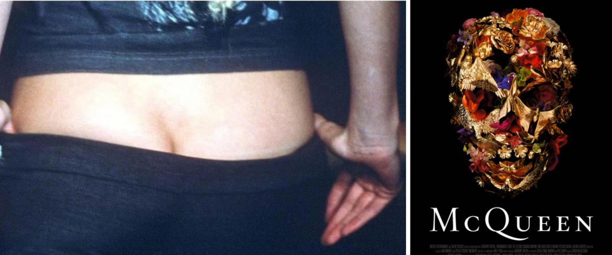 Los famosos “Bumster trousers” (1995) e imagen del documental Mcqueen con su icónica calavera.