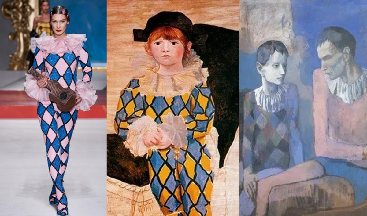 Vogue.com - Bella Hadid vestida de arlequín uno de los personajes icono de Pablo Picasso. Diversos arlequines de Pablo Picasso años 10 del S.XX