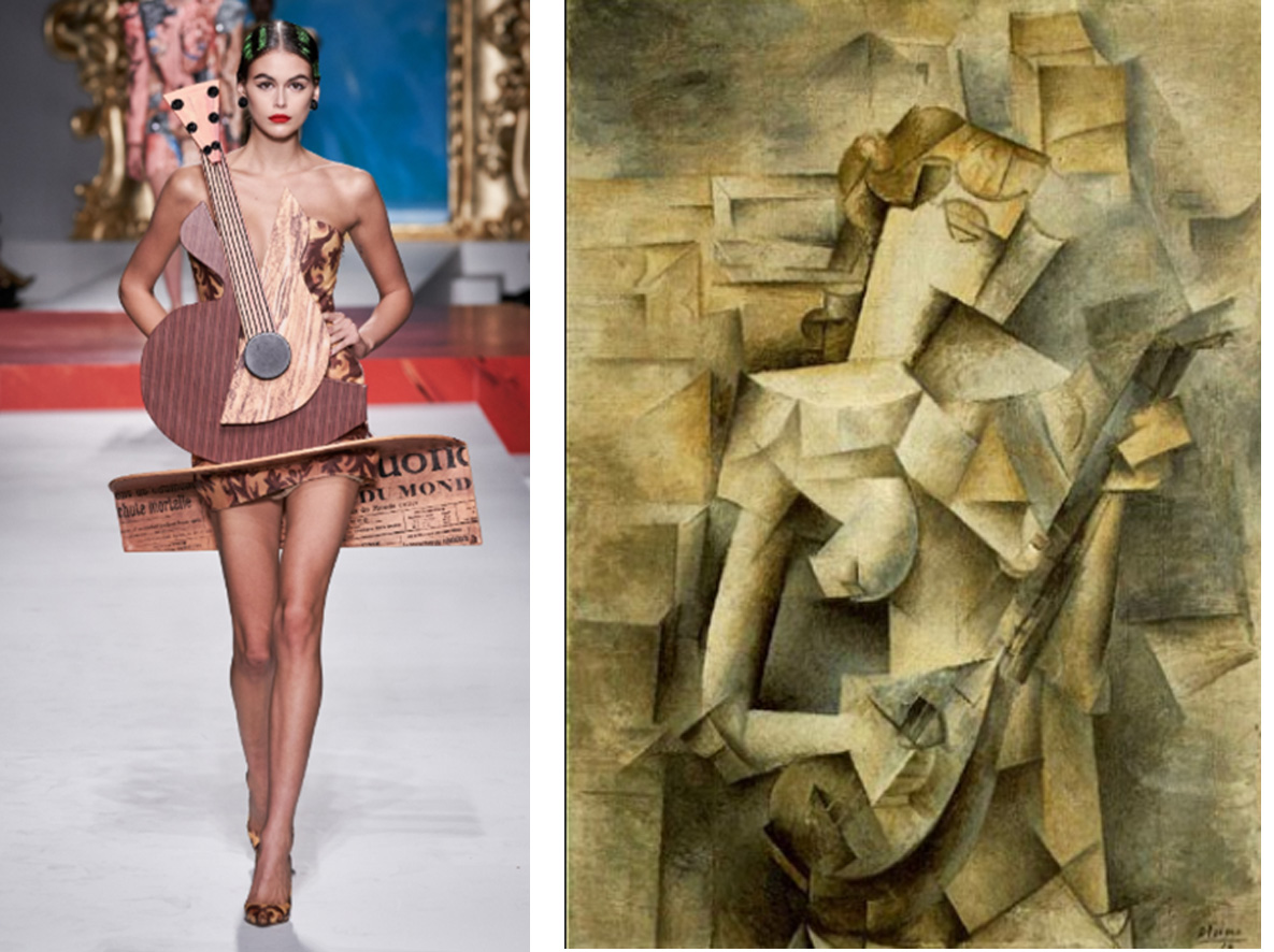 Vogue.com - Kaia Gerber vestida como la obra Chica con Mandolina. Obra chica con mandolina de la etapa cubista de Picasso, años 20