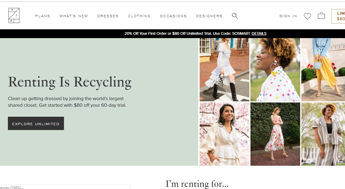 Se llamaba (y se llama) Rent The Runway, es decir, 'Alquila la pasarela'. Utiliza el eslogan Alquilar es reciclar, señalando que el alquiler de ropa es la verdadera moda sostenible. Con ella, no necesitas pagar una cantidad elevada de dinero, sino que puedes alquilar las prendas que necesites cuando sea necesario, a cambio de una cuota mensual.