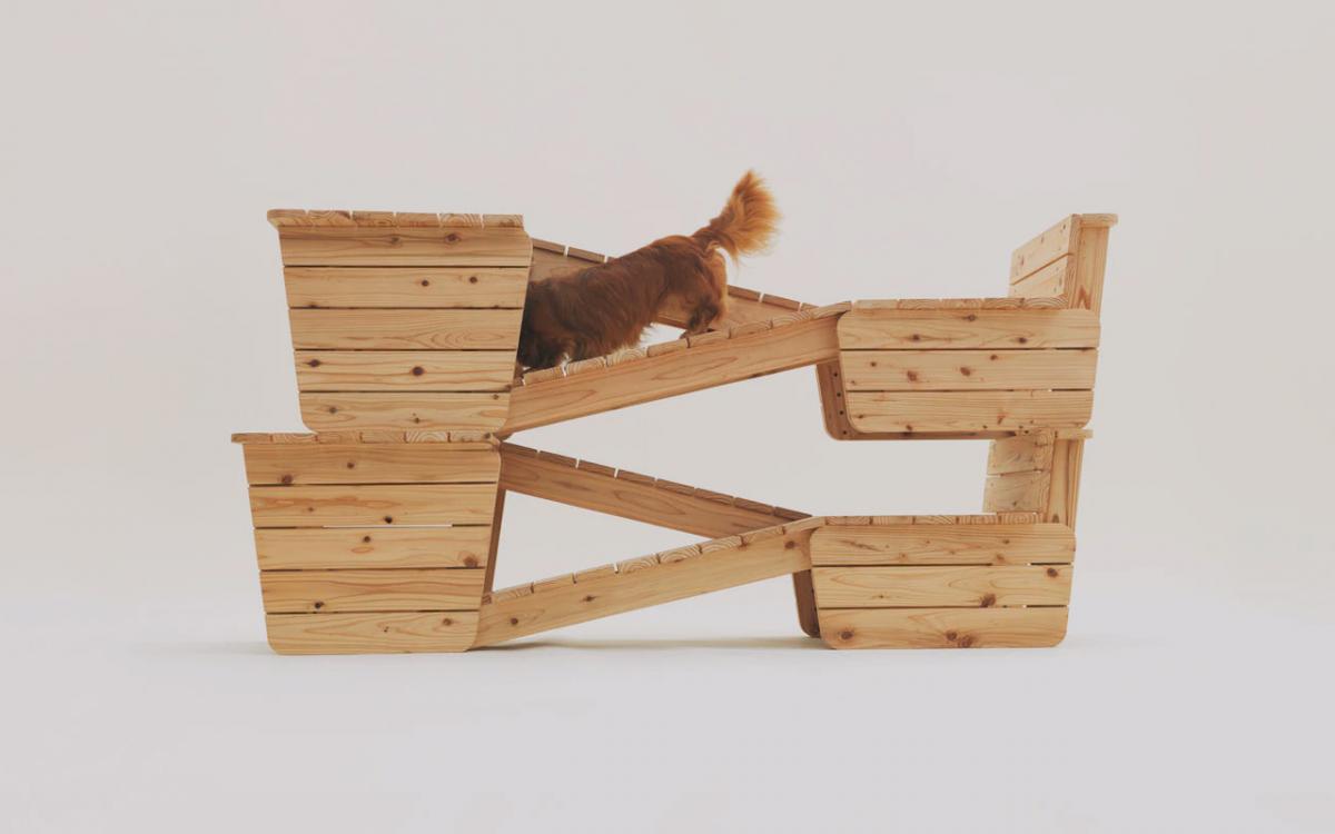 Entre las propuestas de la colección, el atelier Bow-Wow propone un sistema donde ganar altura para los perros con patas cortas, a quienes se les hace difícil trepar fácilmente a una silla. Una casita en forma de atrio, en donde el perro se puede cobijar y a la vez divisar su entorno con una perspectiva que la naturaleza no le facilitó.