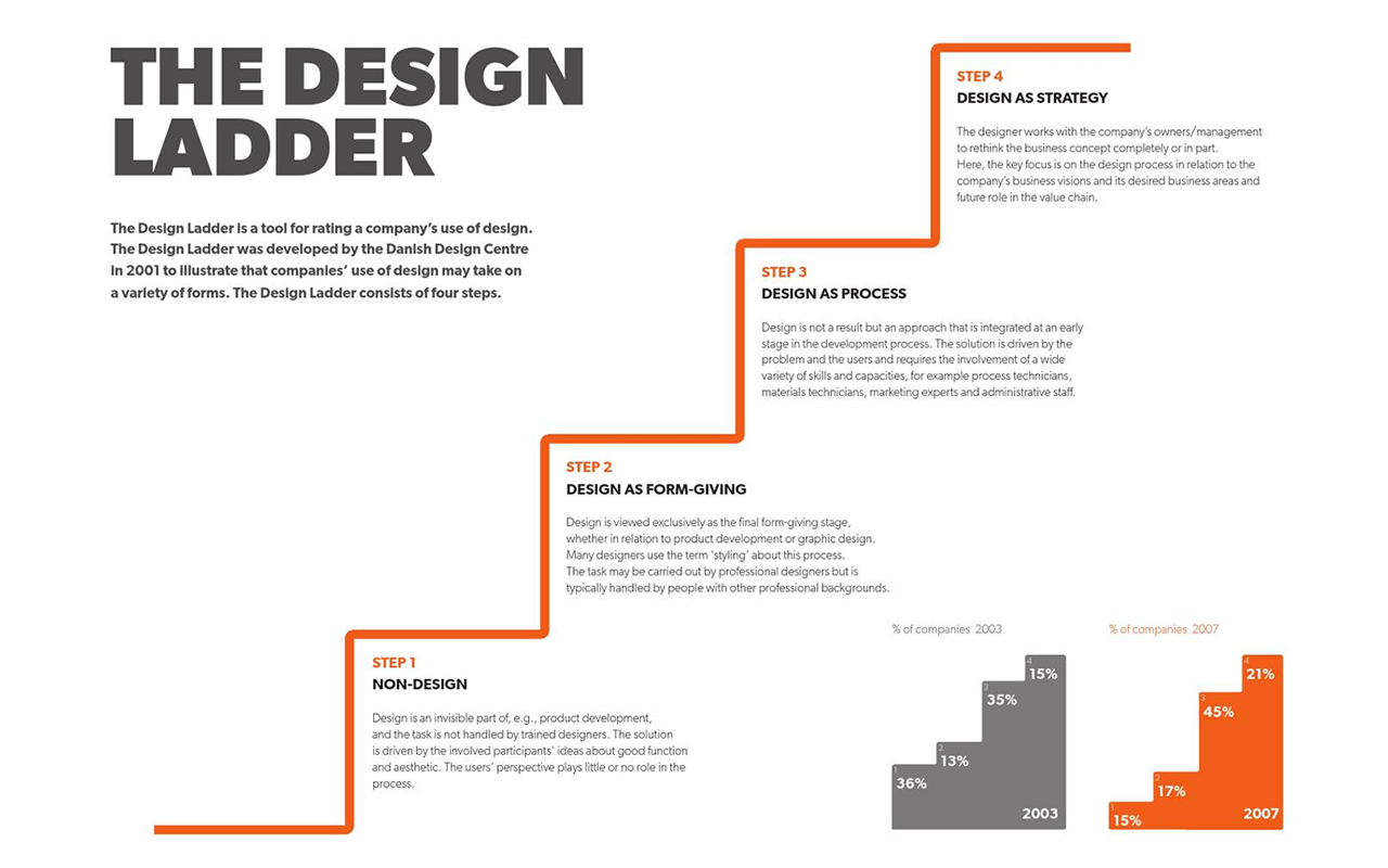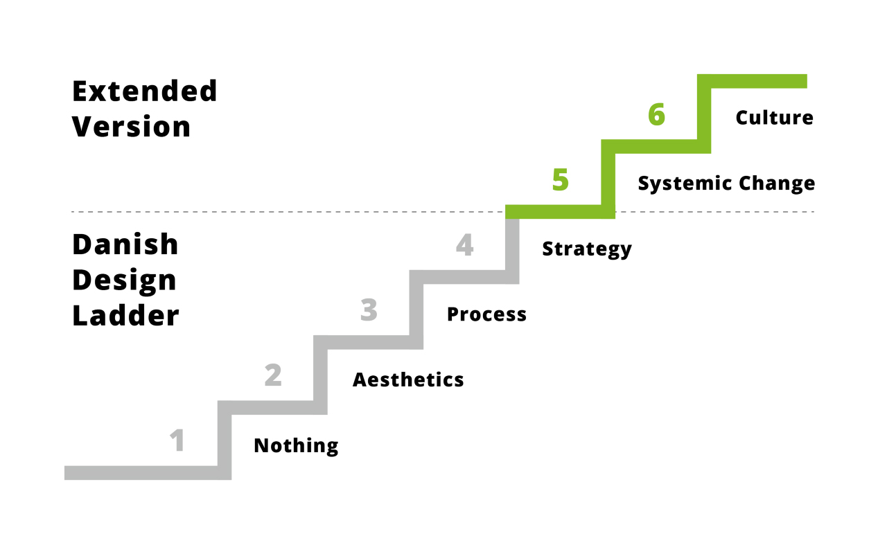 El modelo danés culmina con este cuarto peldaño, cunado la empresa integra la colaboración con el diseñador para repensar el concepto empresarial total o parcialmente. Aquí, el enfoque clave está en el proceso de diseño en relación con las visiones comerciales de la empresa y sus áreas comerciales deseadas y el papel futuro en la cadena de valor.