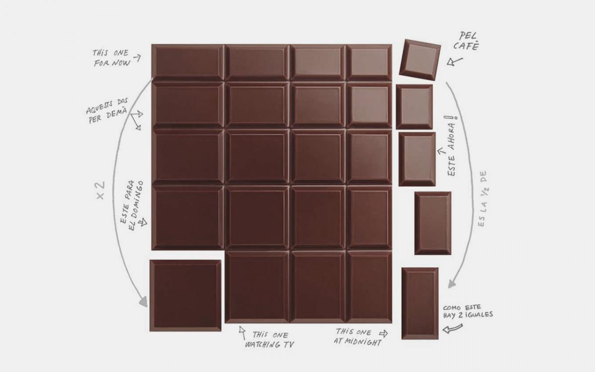 Los atributos formales y funcionales de la tableta de chocolate han ido revisándose a lo largo de los años. Un ejemplo de ello es la propuesta que Emili Padrós planteó en 2004, al diseñar Chocodosis, un proyecto para el chocolatero Enric Rovira, en la que a partir de un juego de geometrías nos propone un singular sistema de dosificación de las porciones.