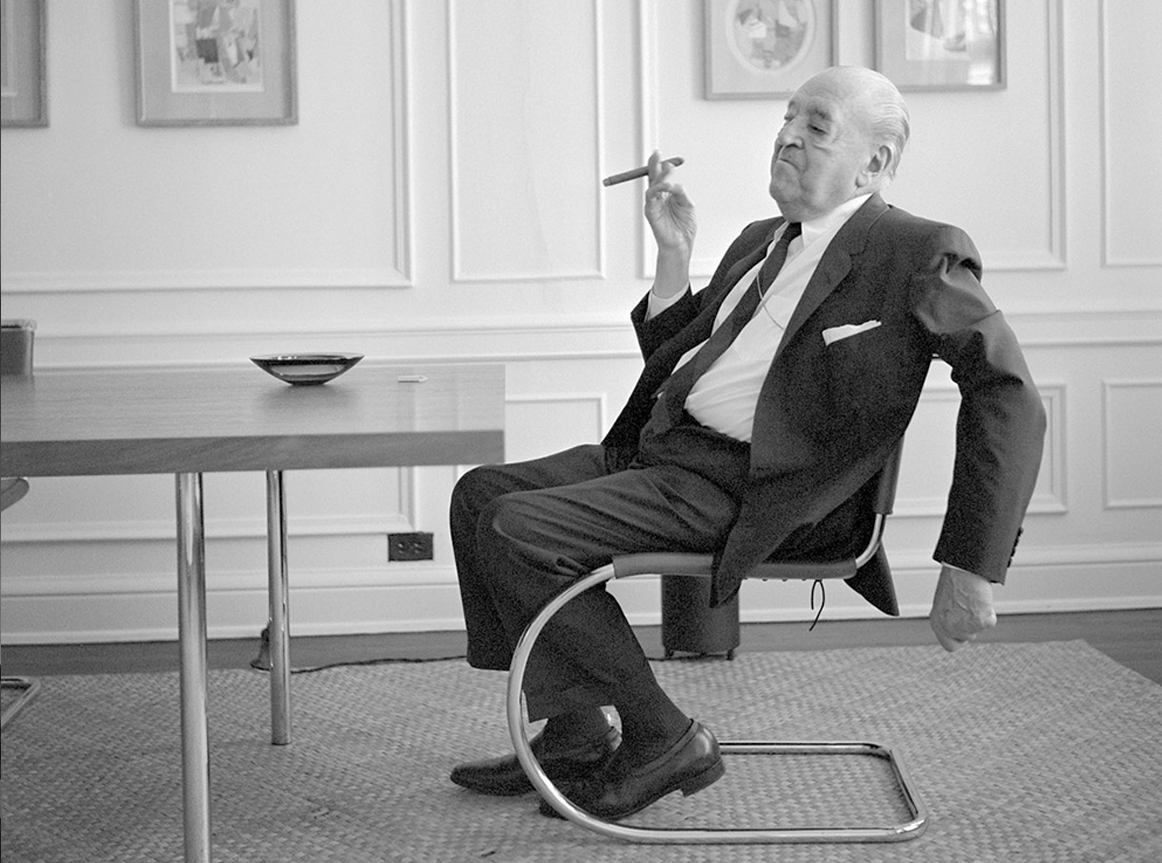 Mies van der Rohe sentado en la silla MR20, fumando. © Werner Blaser.