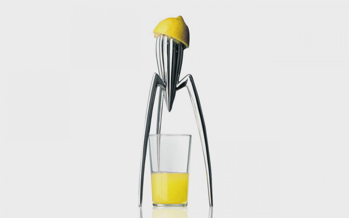 En 1990, Alessi inició lo producción de Juicy Salif: un exprimidor diseñado por Philippe Starck, fabricado en aluminio pulido y que reinterpretaba la forma de exprimir un cítrico. El objeto, sin embargo, no funciona bien; es poco estable y derrama el jugo fuera del espacio previsto. Una mala solución que con el pretexto de la innovación formal, banaliza el proceso creativo. Aún así, se ha convertido en uno de los más apreciados iconos del diseño.