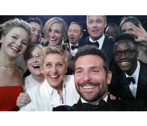 Uno de los selfies más célebres de la historia y que se publico en Twitter, curiosamente - Ellen Degeneres y Bradley Cooper