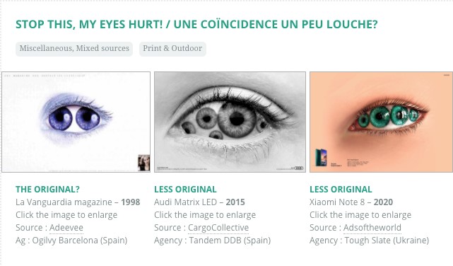 Lo más triste de todo es que, 21 años más tarde, Joe la Pompe siga siendo relevante. Siguen habiendo intentos de atraco creativos por todo el planeta, ya sea en forma de una simple gráfica, un concepto, un key visual o, ya en nuestra época actual, cualquier pieza y formato de comunicación que requiera una idea a comunicar. Su existencia nos proporciona a alguien que vigila a los ladrones de ideas, pero por otro lado da un poco de pena. En cualquier caso os invito a que le echéis un vistazo y paséis un buen rato viendo buena creatividad, buena dirección de arte,... y buenos plagios.