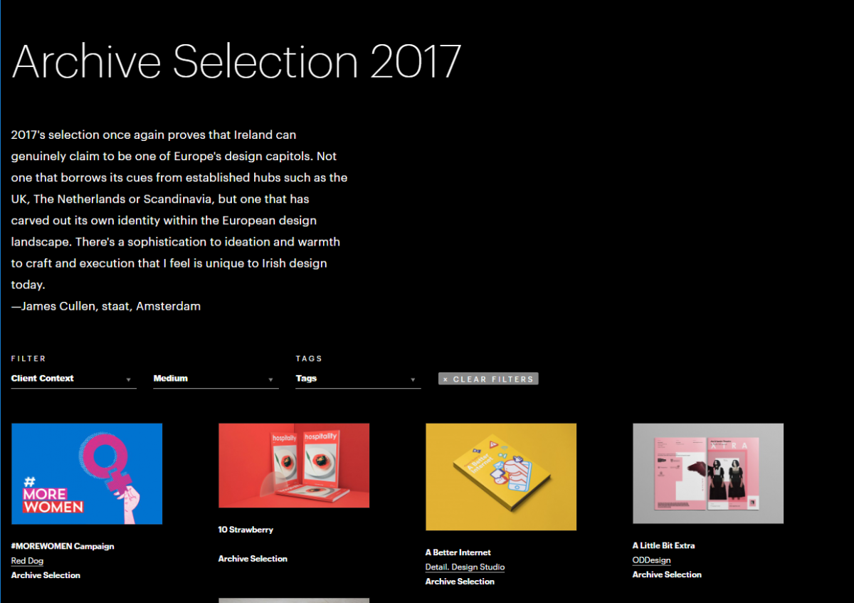 La selección de archivos de cada año suele mostrar el trabajo de más de 90 diseñadores, la mayoría de los cuales se encuentran en Dublín (en 2017, aproximadamente el 70%) y un número creciente de presentaciones provenientes de diseñadores de otras partes de Irlanda y otras partes del mundo. Atraer más trabajo desde más allá de la capital es una prioridad para los próximos años, al igual que mejorar la proporción de género (actualmente, en torno a dos diseñadores masculinos por cada mujer que aparece en las selecciones anuales).