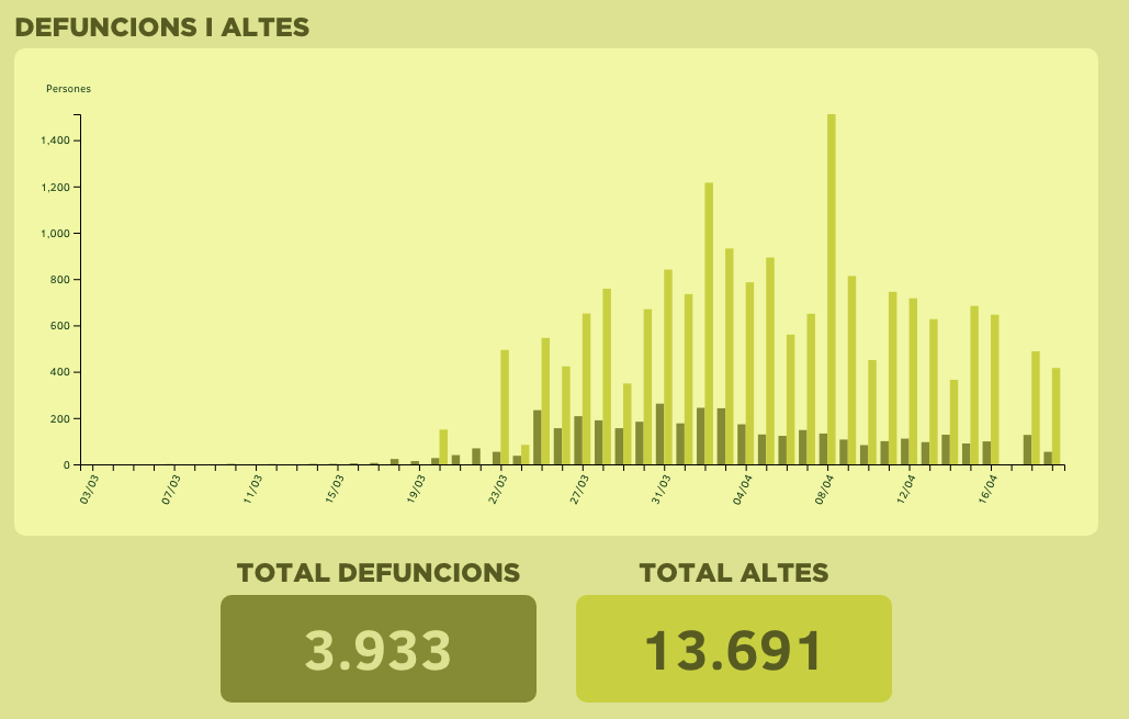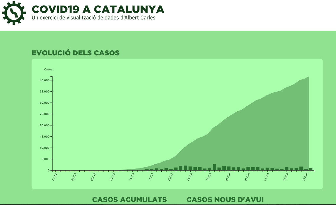 Albert Carles, diseñador y activista de la las libertades digitales, ha creado una web donde va actualizando los datos que ofrece la Generalitat de Catalunya. Según el mismo dice: “Este ejercicio pretende dar significado a las (escasos) datos que tenemos sobre la pandemia que nos tiene a todos preocupados y ayudar a dimensionar la gravedad y los riesgos de este episodio. Ojalá os sea útil” De hecho, Albert Carles es el alma mater de “Esc”, unos encuentros anuales sobre cultura y creación digital. Este año, con motivo de la situación de confinamiento, Esc se ha convertido en “Intro”, un encuentro digital donde podremos conocer diversos proyectos que han surgido como respuesta a la situación que estamos viviendo actualmente. Todo ello mediante tres días de charlas, conciertos y una exposición online.