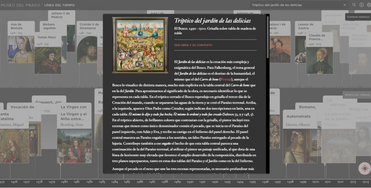 Esta Línea del tiempo es un caso de aplicación de las directrices de la Linked Open Data Web o Web de datos enlazados. Desde el museo explican que el Grafo de Conocimiento del Prado responde a un conjunto de ontologías y vocabularios hibridados construidos de acuerdo con los estándares de la Web Semántica. Eso hace posible que las entidades que maneja el website del Prado, tales como los autores y sus fechas de nacimiento y muerte, pueden encontrar sus entidades homólogas en otros conjuntos de datos, como es el caso de Wikipedia o Wikidata, preguntándoles a éstas por aquellos datos relacionados, como es el caso, con un determinado año. Esto permite proveer a cada obra y autor del Prado de un contexto muy específico y a la colección en su conjunto de un gran escenario de información y conocimiento que es muy útil para enseñar y aprender.