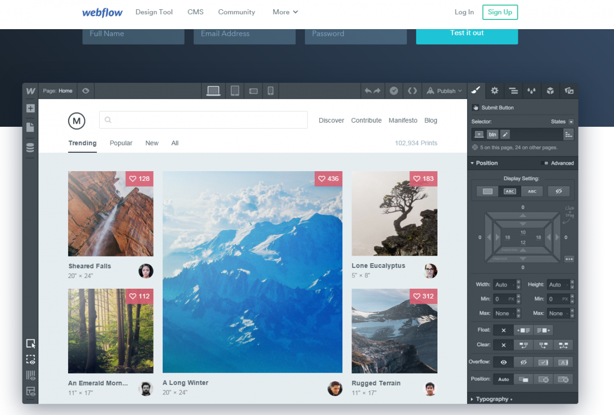 Y por último, existen prototipos que reflejan el aspecto y la usabilidad del producto final y ofrecen a los interesados en el producto la oportunidad de experimentar interactuando con la interfaz y contenido del proyecto, a la vez que probar las principales interacciones de una manera similar al producto final. Entre estos destaca por su fiabilidad y facilidad de uso, el programa Webflow. Esta plataforma permite construir sitios web sin necesidad de programar. Ofrece un editor online de sitios web que permite, arrastrando y soltando elementos, generar resultados realmente profesionales, incluso adaptados a teléfonos móviles. Al mismo tiempo, permite exportar el código para instalarlo en nuestro servidor si necesidad de haber participado en su creación (el código se genera de forma automática en función del diseño creado).