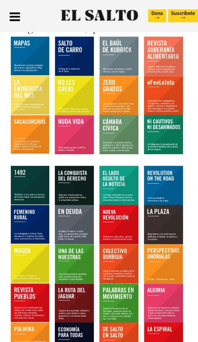En una escala mucho más modesta pero con un planteamiento muy profesional, tanto en contenido como en diseño está El Salto (Diario). Tanto el uso de la tipografía como la navegación y la usabilidad son excelentes. La publicidad aunque hay no molesta constantemente la lectura de los contenidos. Una de las partes más interesantes es su sección de blogs. En ellos tenemos contenidos especializados en multitud de temas y con el sello de su autor/a. También la posibilidad de dejar comentarios y el acceso a ellos es rápida y sencilla. Durante la lectura de un artículo van apareciendo artículos relacionados. Es algo que veo en más medios y que me parece muy inteligente porque, por un lado ves la opción de obtener más información sobre aquello que lees y el medio te retiene más tiempo en su aplicación.