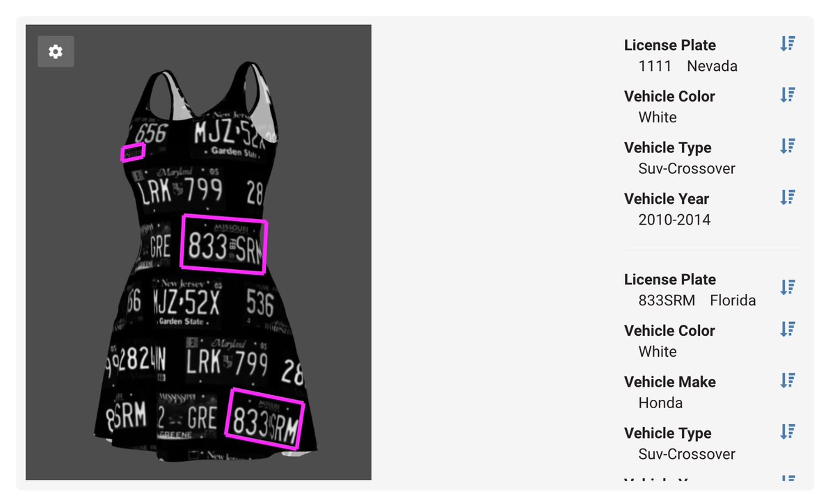 Al mismo tiempo para el ojo humano, el contenido de la ropa es un texto que contiene palabras escritas en negrita y en color amarillo y que forman parte de la cuarta enmienda de la constitución de los Estados Unidos. Esta es una enmienda usada para defender a la ciudadanía de "registros e incautaciones irrazonables". Otros diseños se basan en matrículas falsas; algunas piezas, de hecho, consisten únicamente en esas matrículas sobre un fondo de un solo color, mientras que otros incluyen los números en medio de un patrón de circuitos. Los patrones han sido diseñados para que puedan ser leídos fácilmente por las cámaras en situaciones de buena iluminación; aunque su creadora recomienda coger una talla más grande de la que tenemos, para que los patrones estén lo más planos como sea posible y el engaño funcione mejor. Se pueden comprar en su web https://adversarialfashion.com/.