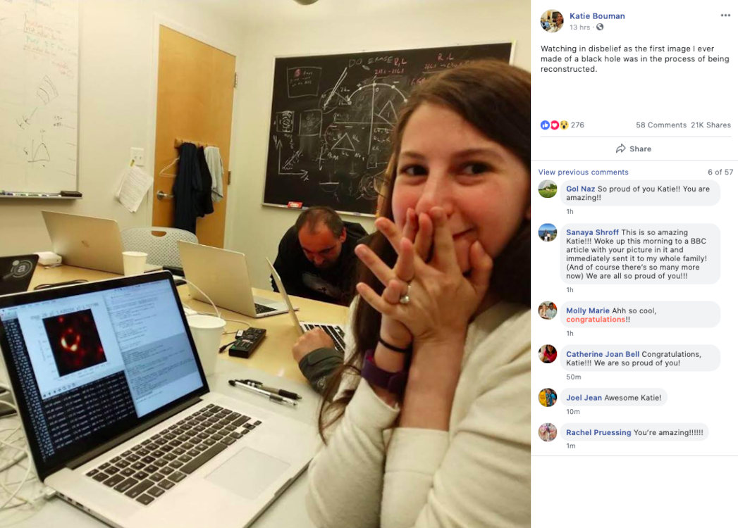 Estos días hemos visto por primera vez el aspecto que puede tener una “Agujero Negro”. Este cuerpo estelar, o anticuerpo para ser exactos, ya lo especuló Einstein pero hasta ahora no se había podido fotografiar. El logro, aunque colectivo, se debe en gran medida a una mujer, la Dra. Katie Bouman. Ella es la creadora del algoritmo para integrar los más de 5 mil millones de gigabytes de información recopilada por 8 radiotelescopios y 200 científicos alrededor del mundo, para formar, en tres años de trabajo, la primera imagen real de un Agujero Negro. “Somos un crisol de astrónomos, físicos, científicos e ingenieros, que es lo que se necesita para lograr algo que parecía imposible”, dijo la ingeniera en Electrónica y Ciencias de la Computación. Bouman comenzó a desarrollar el algoritmo hace tres años, cuando era estudiante de posgrado en el Instituto de Tecnología de Massachusetts (MIT por sus siglas en inglés). Allí, lideró el proyecto con la asistencia de un equipo del Laboratorio de Ciencias de la Computación e Inteligencia Artificial del MIT, el Centro de Astrofísica Harvard-Smithsonian y el Observatorio Haystack del MIT. Obviamente, y como ella misma dice es un logro colectivo, Andrew Chael, compañero en el MIT de Bouman, también ha contribuido de forma notoria al proyecto, hasta el punto de que algunos internautas le atribuían a él el mayor mérito. El propio Chael se apresuró a desmentirlos. En una entrevista con The Washington Post, Chael detalló que realizó un trabajo importante, pero Bouman "realizó una enorme colaboración en cada etapa". "Claramente, la campaña, fue iniciada por gente que estaba molesta porque una mujer se convirtiera en la cara de esta historia”, declaró.