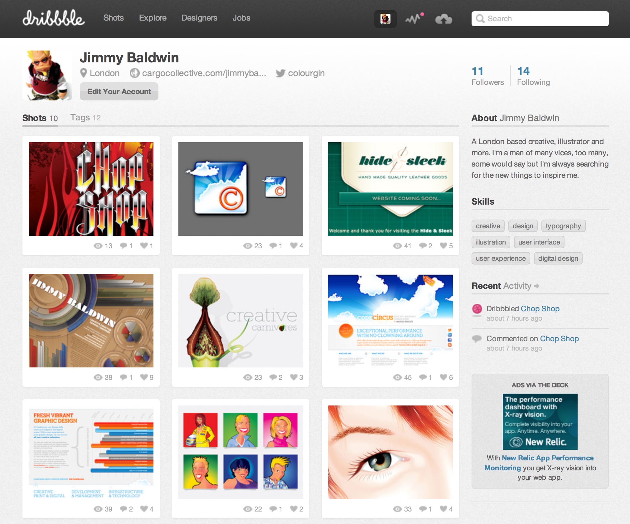 Dribble es una red muy popular entre la comunidad de diseño gráfico. En ella no solo puedes compartir tus diseños. También puedes hacerlo con el proceso de creación de tus obras, al completo o solo de una parte. Para ello puedes utilizar las conocidas como Tomas, que pueden ser pequeñas imágenes o capturas de pantalla. Los diseñadores comparten sus obras y contactan entre ellos. También pueden hacer comentarios breves de lo que les parecen las obras de otros.