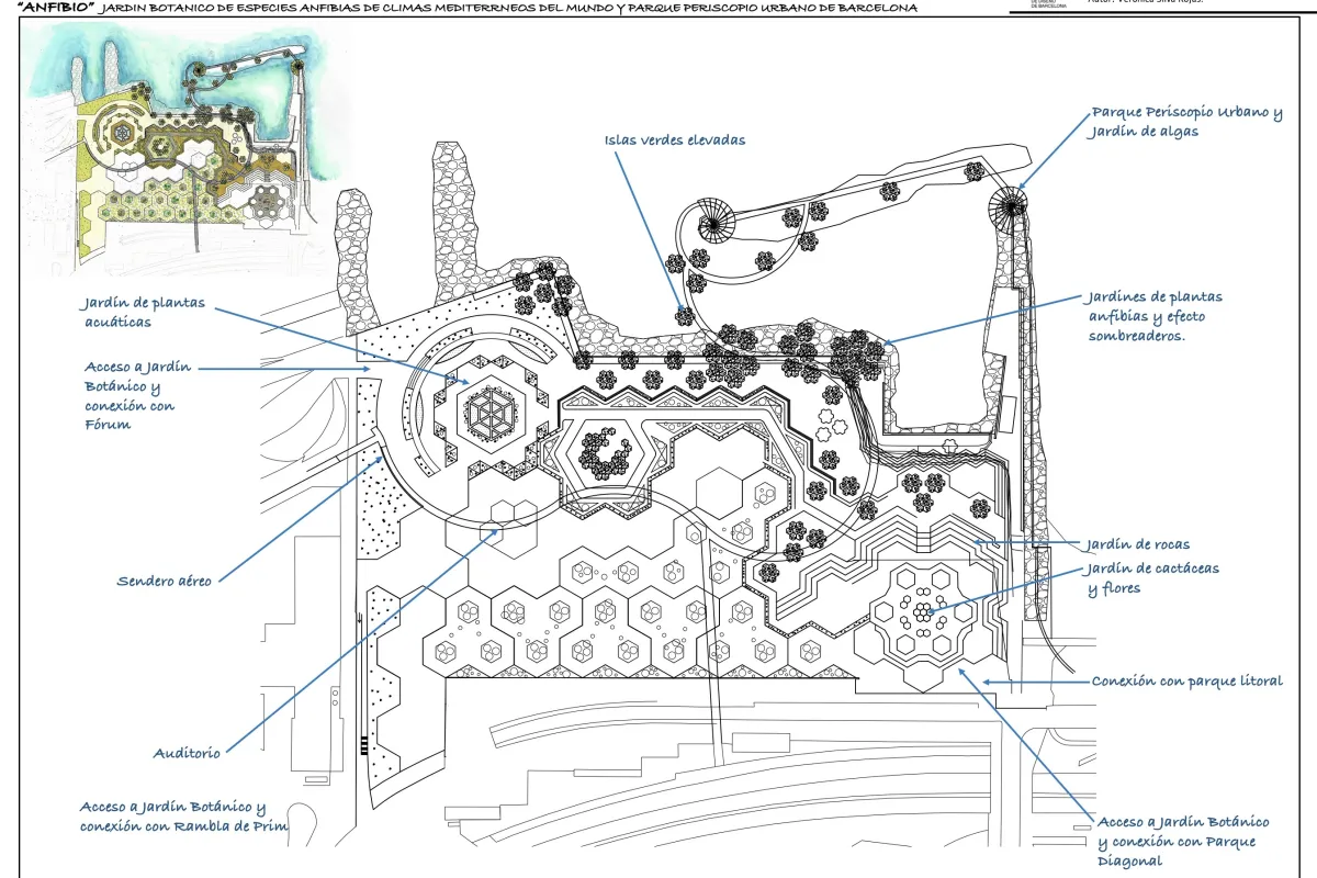 ANFIBIO es una propuesta arquitectónica de un parque y jardín botánico en Barcelona que aspira a contribuir con medidas eficientes para frenar el avance de los efectos del cambio climático en el borde costero. Esta obra arquitectónica pretende utilizar la plataforma de hormigón una vez construida en el puerto de la ciudad, que actualmente se considera un espacio residual, en un nuevo zoo. En este nuevo zoo se quiere recrear los hábitats para que se colonicen de fauna e insectos, provocando una naturalización de un paisaje previamente artificial.