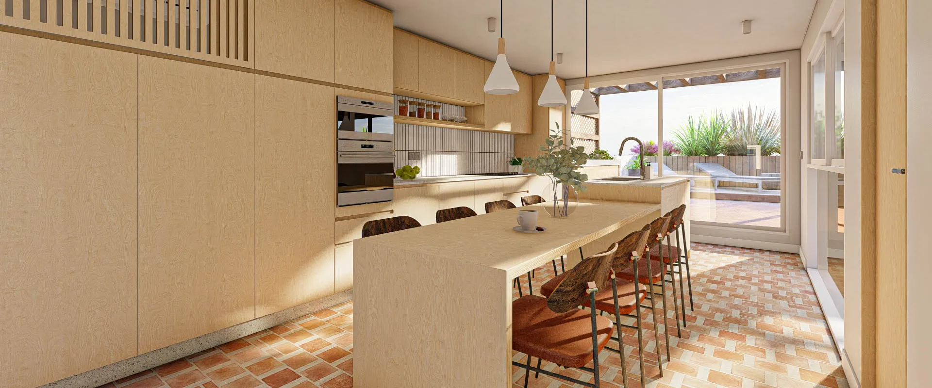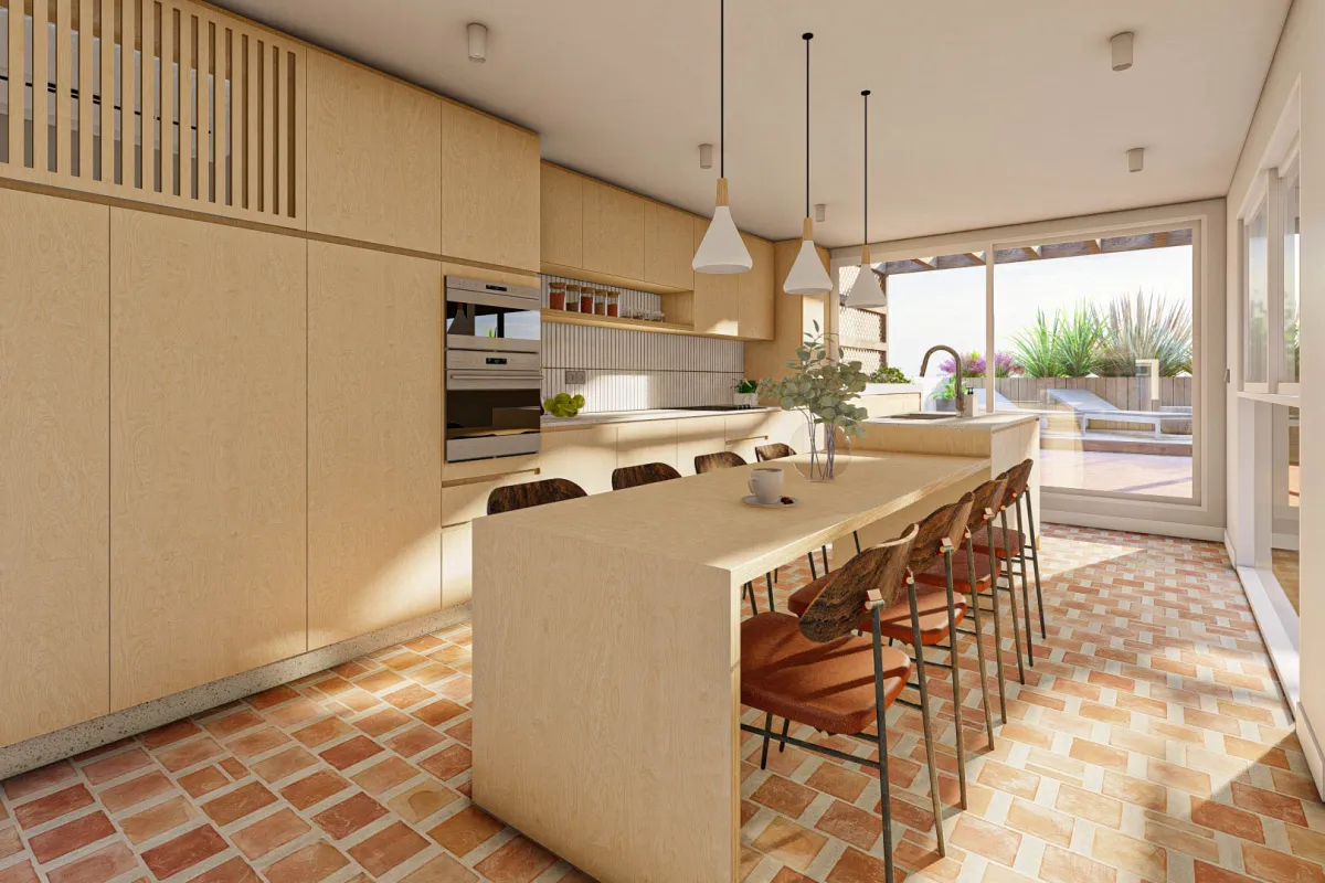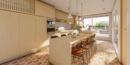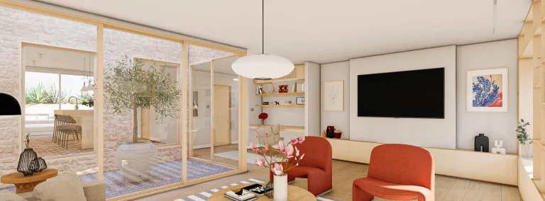 El proyecto se inspira en la arquitectura mediterránea, la luz natural y el contexto urbano barcelonés. A través de una distribución flexible y una cuidada relación entre interior y exterior, se integran espacios privados, zonas comunes y una terraza concebida como prolongación del interior. La elección de materiales naturales, paletas claras y mobiliario a medida refuerza una atmósfera cálida, funcional y atemporal.